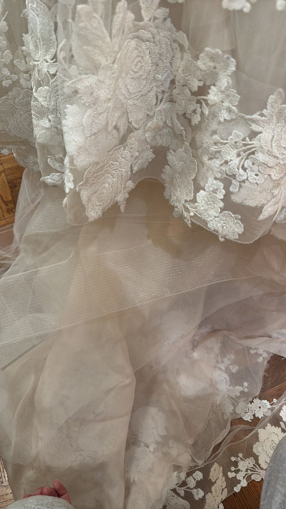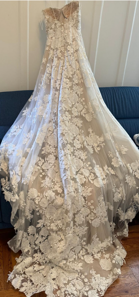 Mira Zwillinger's iconic Messa gown! A luxurious floral embroidered gown with voluminous skirt and rich floral train. This was my dream dress and I felt amazing on it! It feels super light as it's not heavy at all. I got a lot of compliments on this dress from my guests, my photographer, and everyone! They said it was one of the most elegant and beautiful wedding dresses they had ever seen.