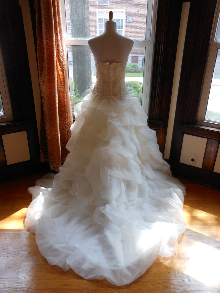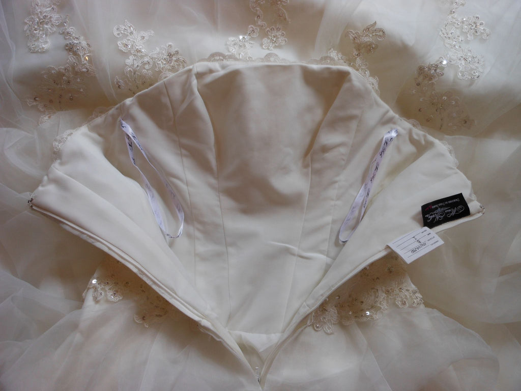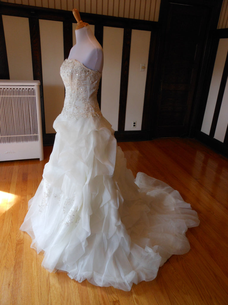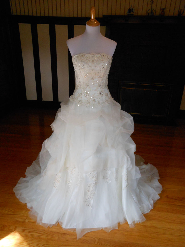 This is an Authentic MISS KELLY PARIS Bridal Wedding Dress Gown. The style number of the dress is MK131-50. It has a gorgeous A line style with a fabulous long train. The gown is embellished with exquisite floral embroidery, and stunning crystals and sparkling beads/sequences on top of the embroidery. The bodice also has boning to build a perfect shape. The skirt has netting petticoat inside to support a full shape. This dress is brand new in great condition with the original label and tags. It was never worn.