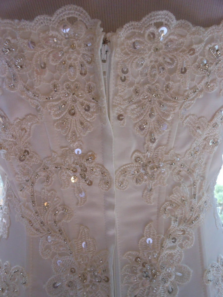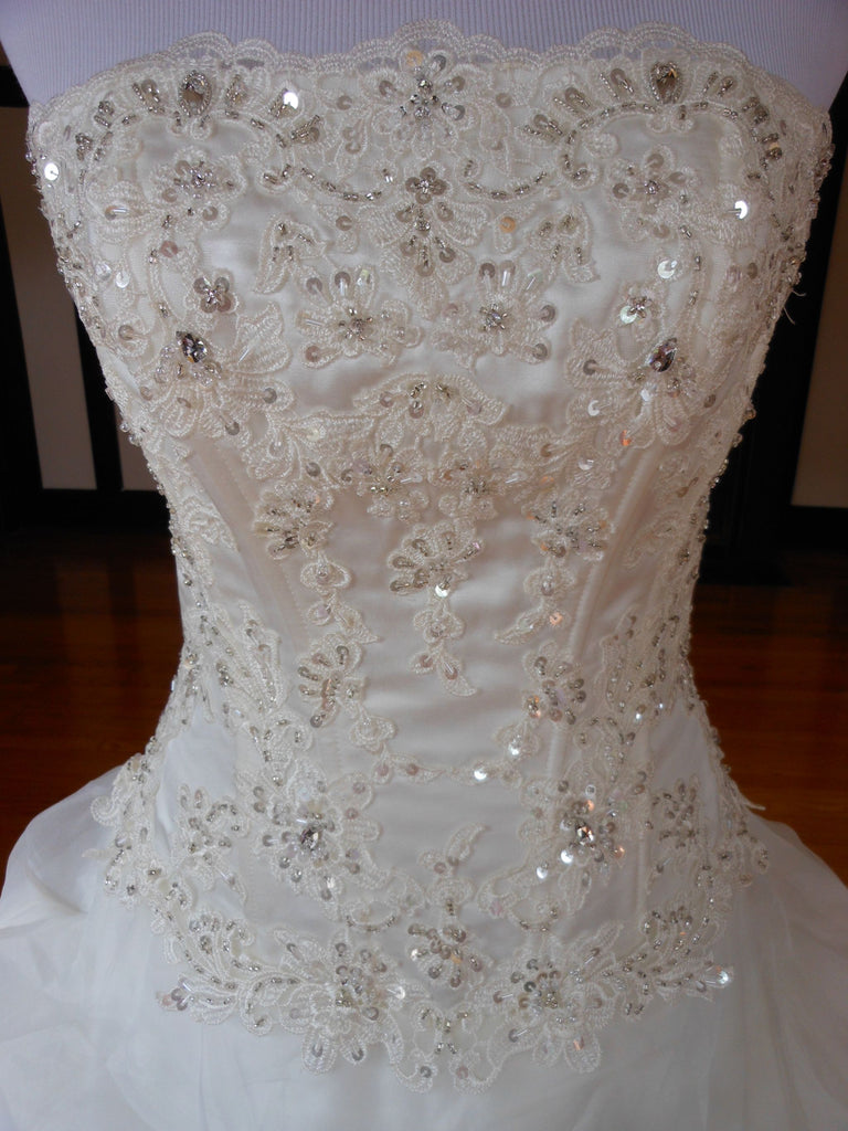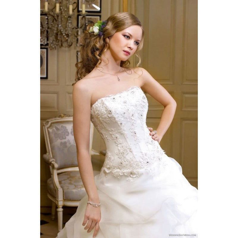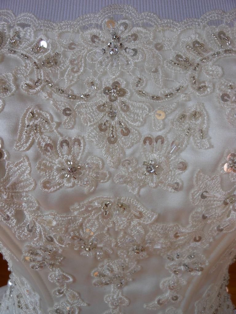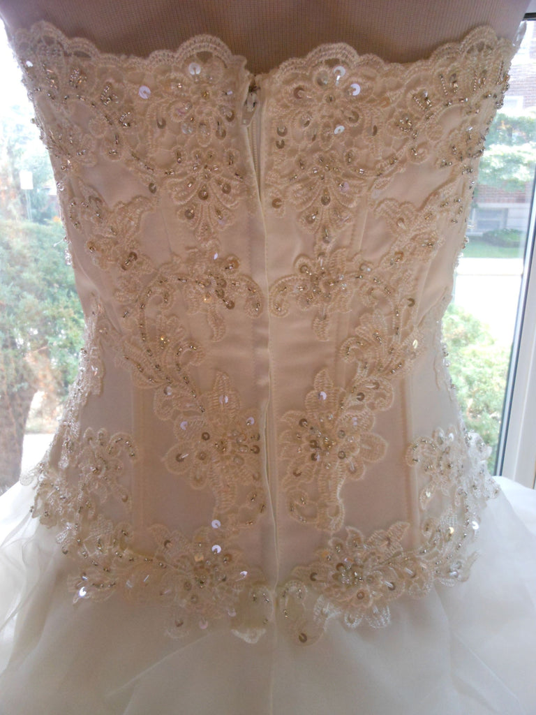 This is an Authentic MISS KELLY PARIS Bridal Wedding Dress Gown. The style number of the dress is MK131-50. It has a gorgeous A line style with a fabulous long train. The gown is embellished with exquisite floral embroidery, and stunning crystals and sparkling beads/sequences on top of the embroidery. The bodice also has boning to build a perfect shape. The skirt has netting petticoat inside to support a full shape. This dress is brand new in great condition with the original label and tags. It was never worn.