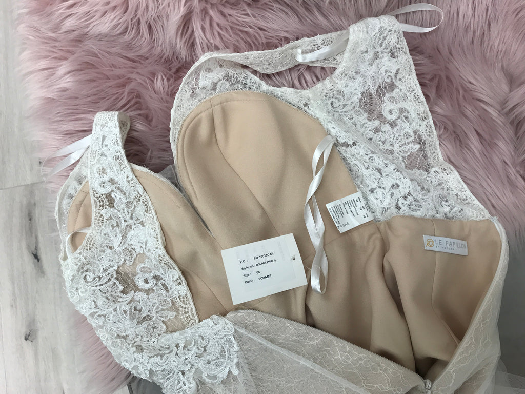 This is a boutique sample gown in impeccable, like-new condition, with all original designer tags and labels intact. It has been gently tried on in-store under careful supervision. We require all clients to wear a body slip and nylon socks during fittings to preserve the gown’s pristine condition. There are no stains, marks, or signs of wear.