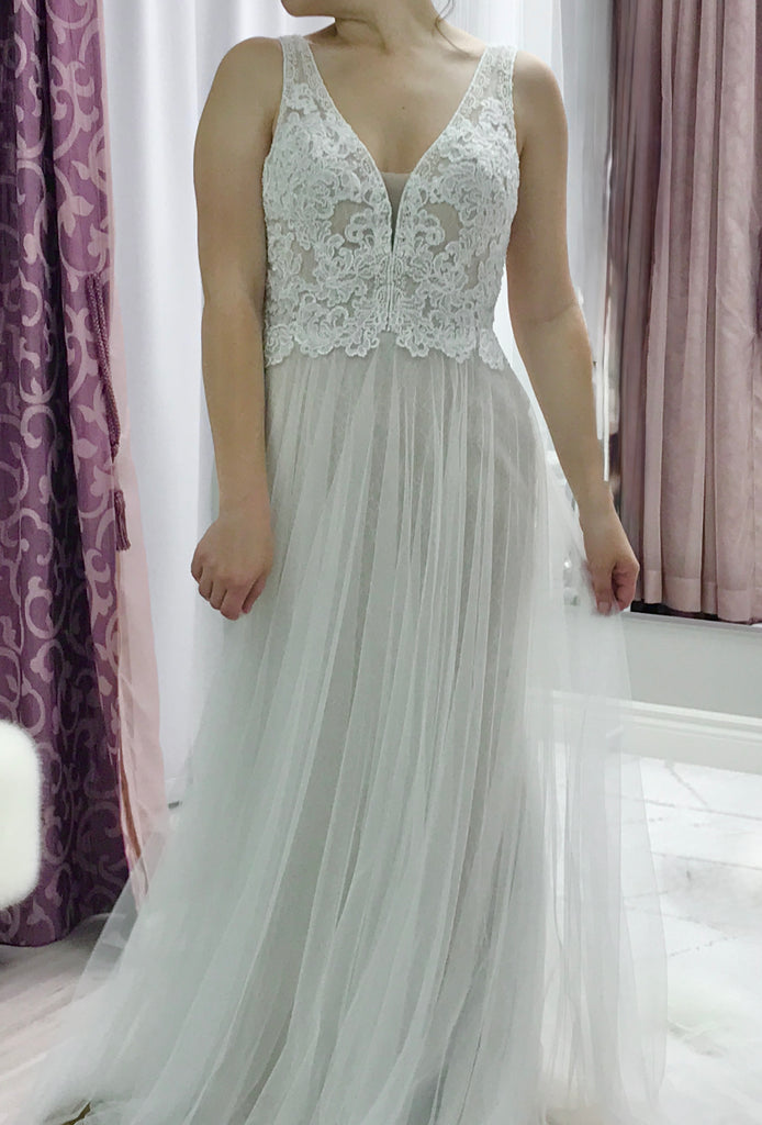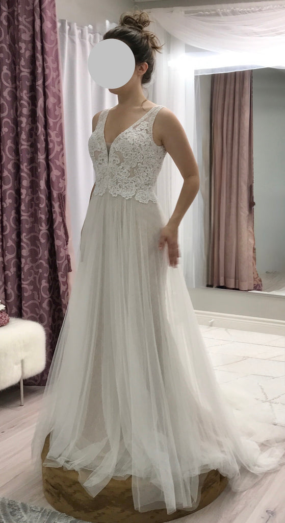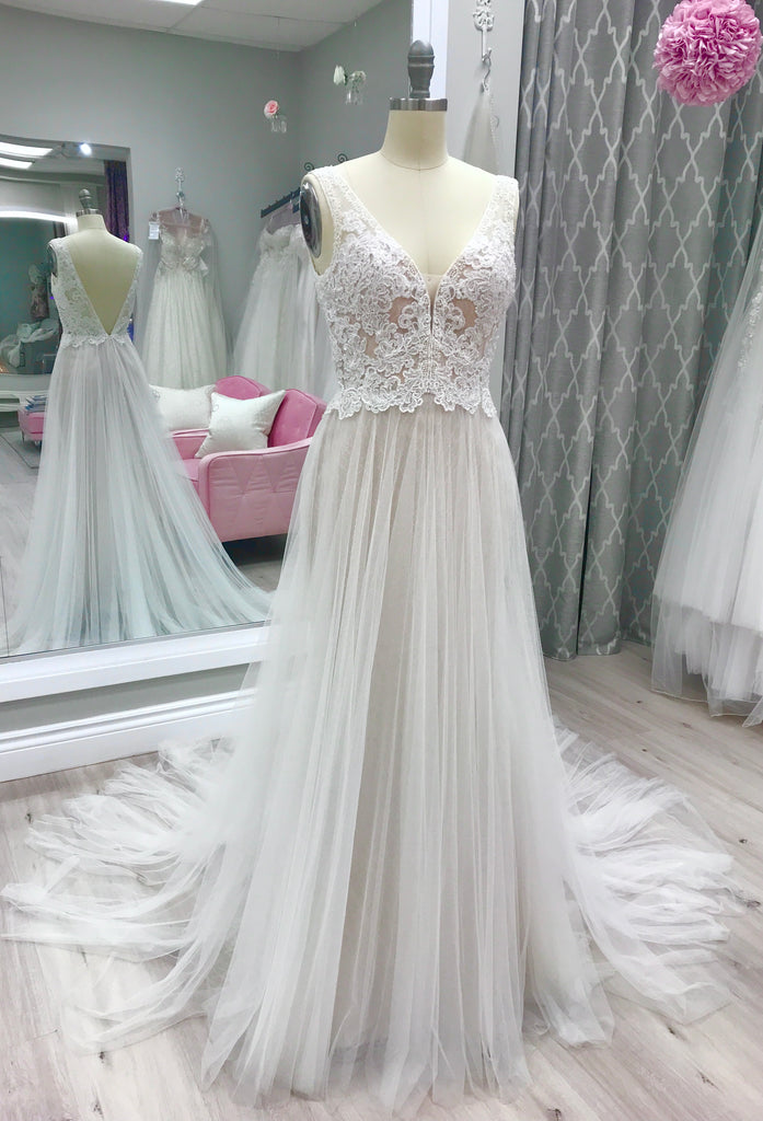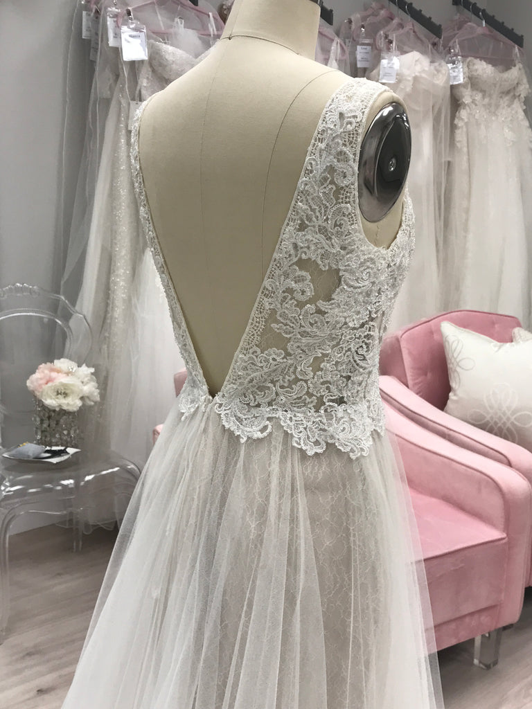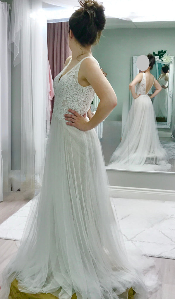 Romantic Bohemian-Inspired Lace & Tulle Wedding Gown – Sample Size 6