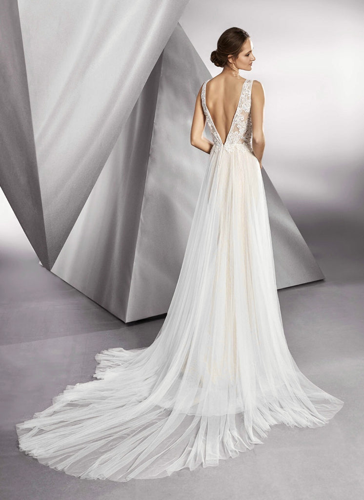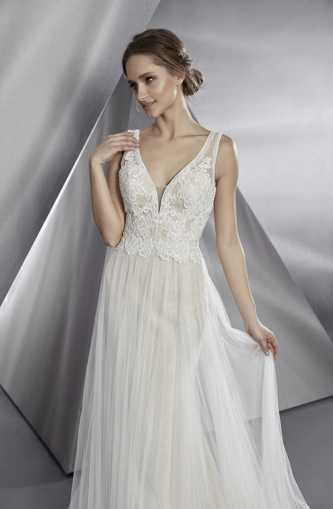 This ethereal, bohemian-inspired wedding gown is beautifully crafted from soft ivory lace and tulle with a delicate champagne underlay. The design is finished with a dramatic, flowing train that makes a breathtaking statement. Unique and exclusive, this gown showcases exceptional craftsmanship and attention to detail.