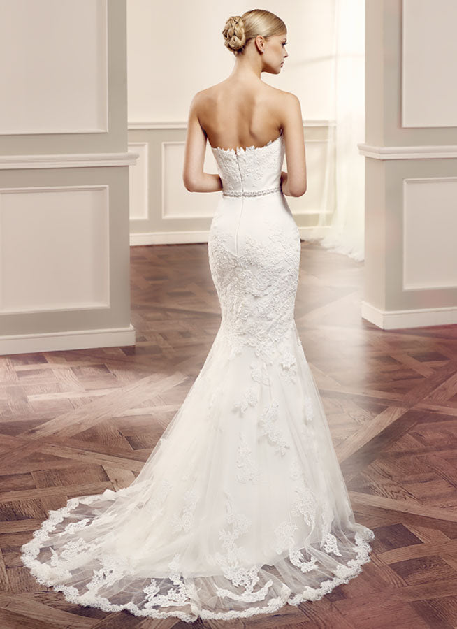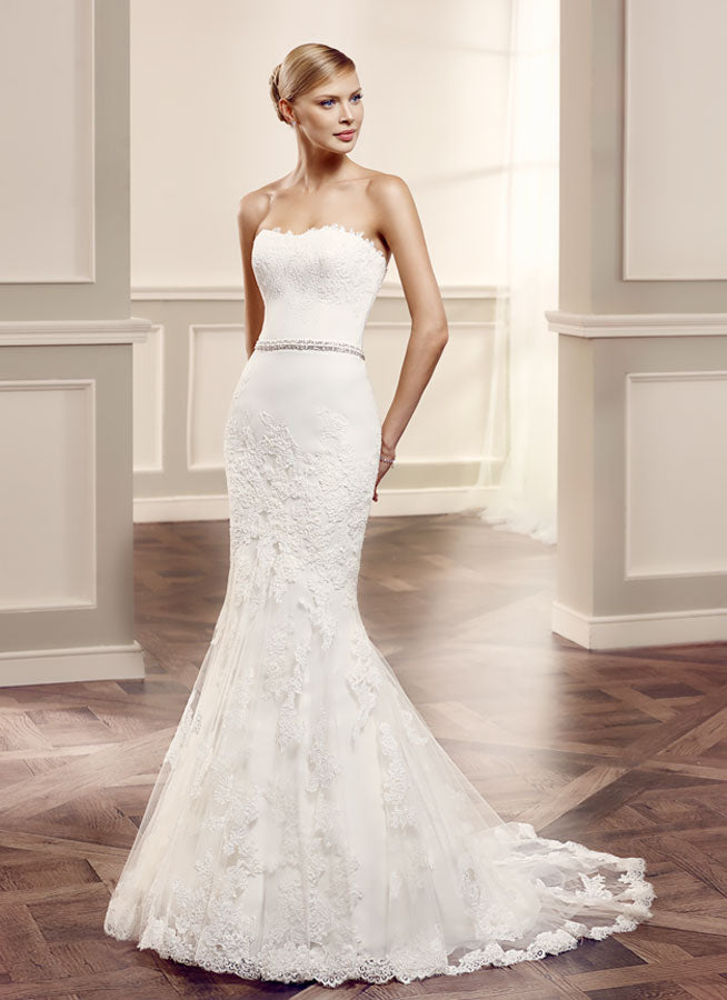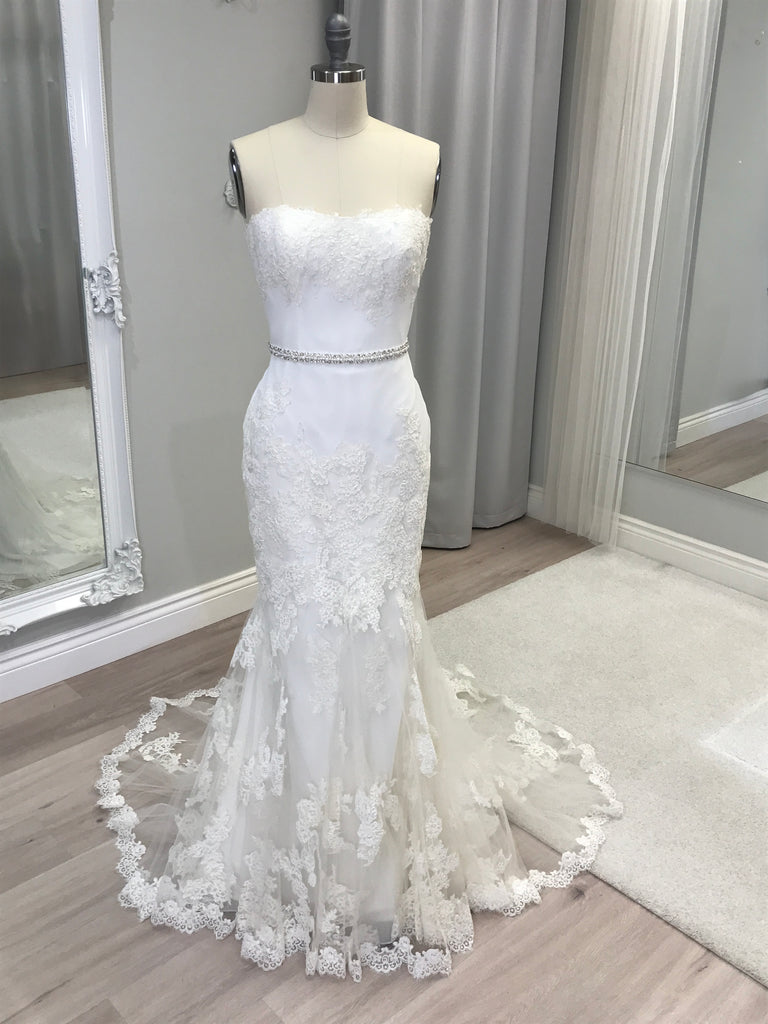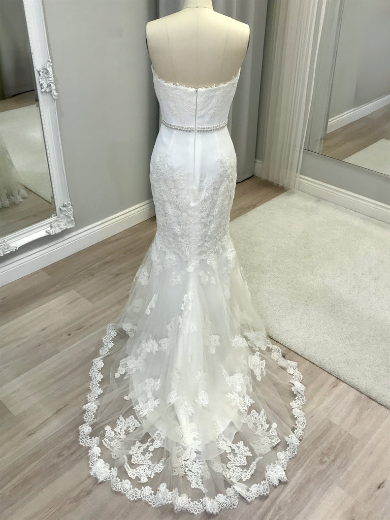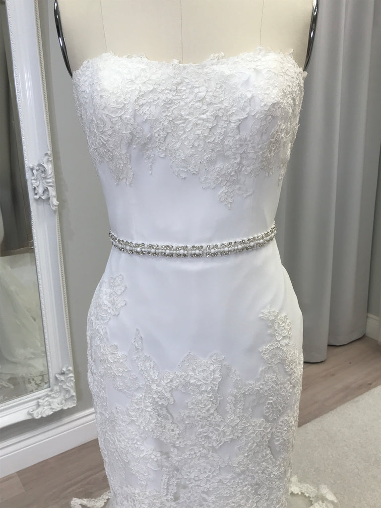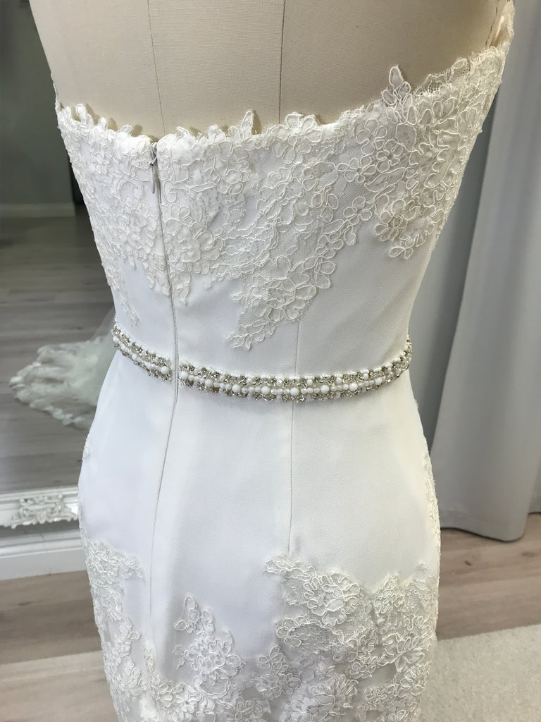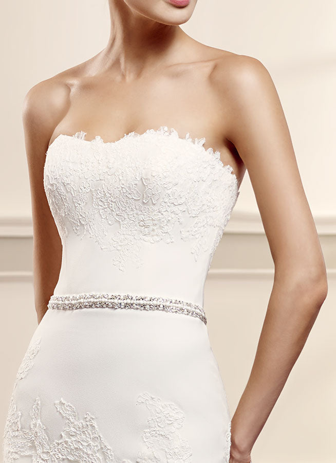 Stunning fit-and-flare gown that blends modern simplicity with timeless romance. Made from luxurious ivory crepe and delicate Chantilly lace, this gown features a strapless corset bodice with a softly embellished waistline sash adorned with pearls and crystals—a detail that adds just the right touch of sparkle.