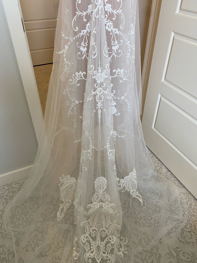 This stunning Nektaria ivory dress in style "Venice" with long sleeves comes complete with a 2-tier veil (see pictures) and 3 bustles (pictured).
