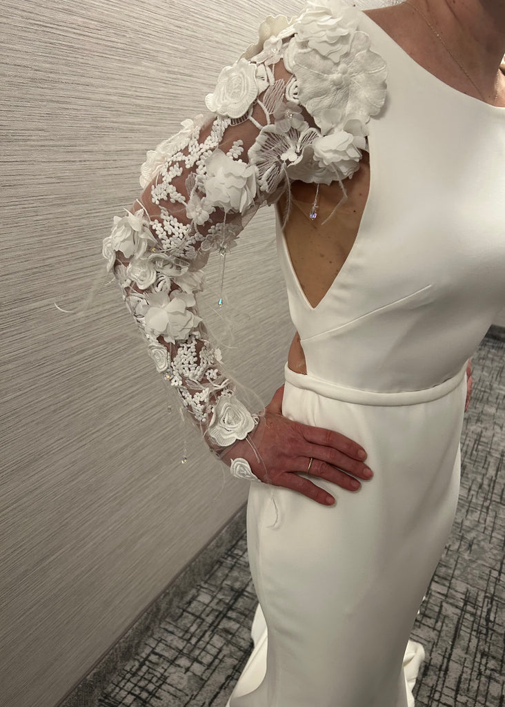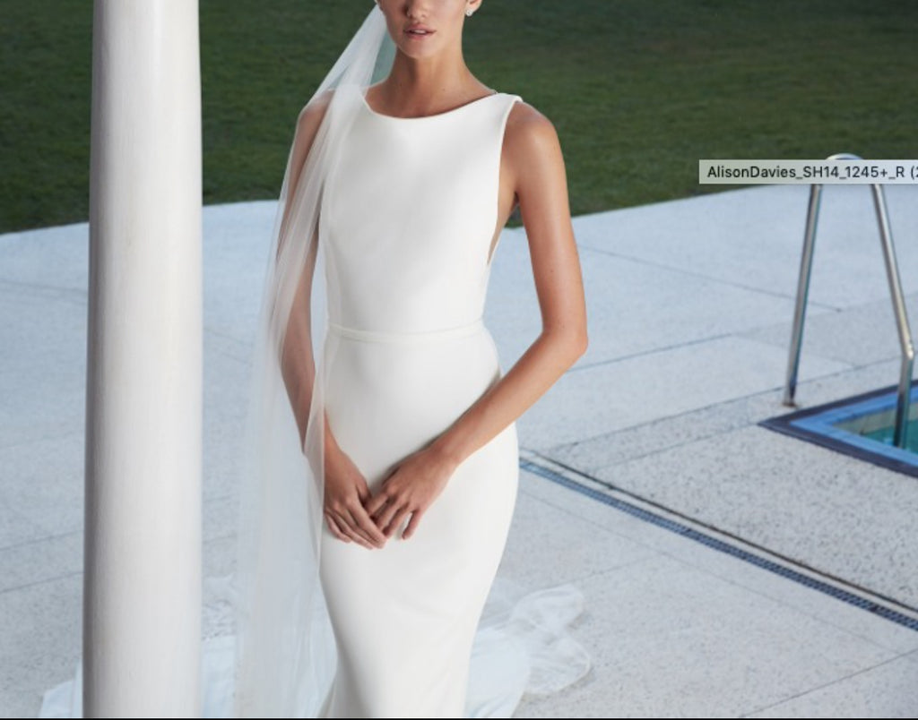 This Alison Davis Ambrosia wedding gown is a true work of art, blending modern elegance with exquisite couture detailing. Crafted in Australia from luxurious Japanese crepe, this sheath-style, floor-length dress offers a flattering, figure-hugging silhouette, complete with a stunning boat neckline and delicate button detailing on the lower back.