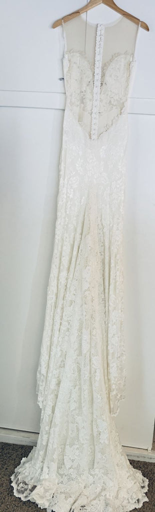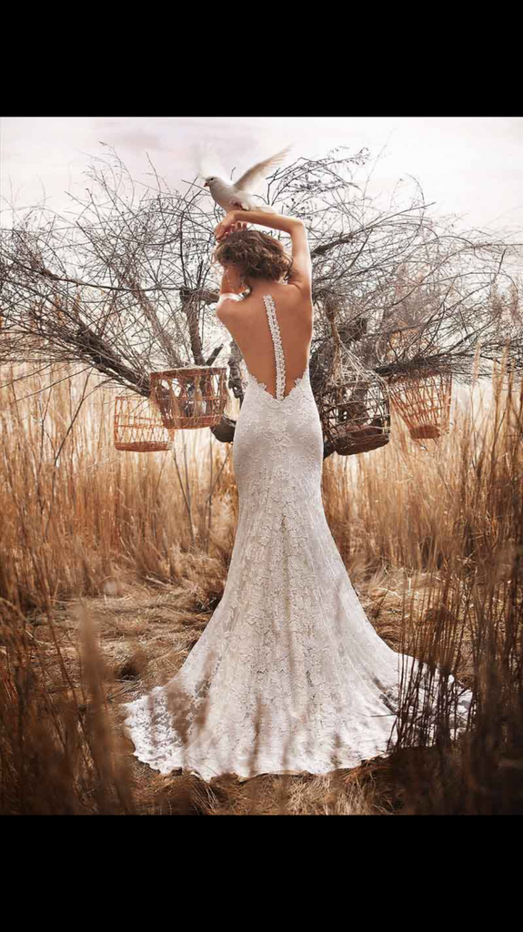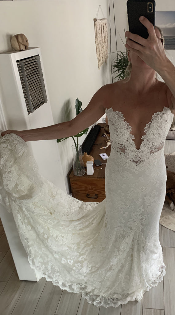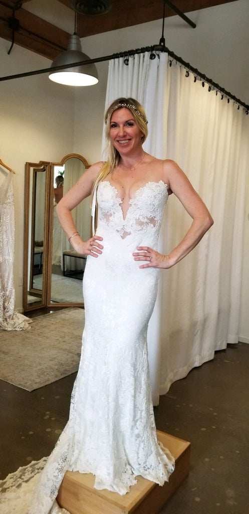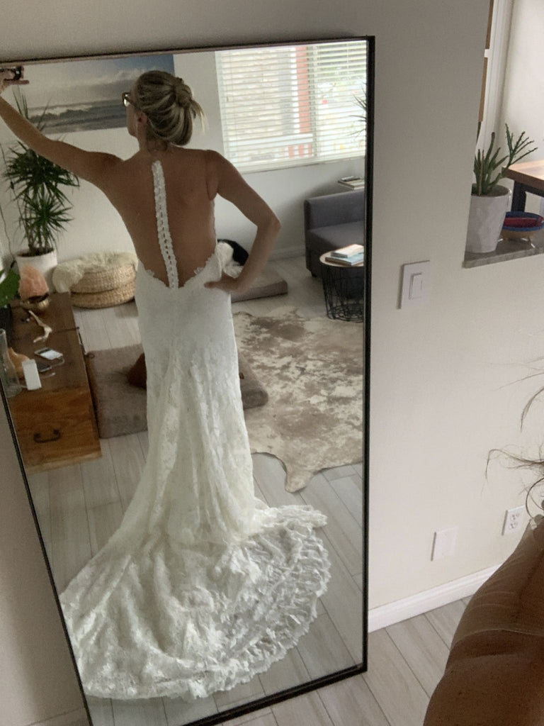 BRAND NEW AND NEVER WORN! How can this be? I changed my venue and needed a different style and vibe and more importantly a dress that I can get wet in, turns out we are taking under water photos. I would not want to do that to this stunning gown. This dress is literally still in the garment bag and was only taken out for a few of these photos at home. The other pics are when I wearing the sample and purchased the gown at the boutique.