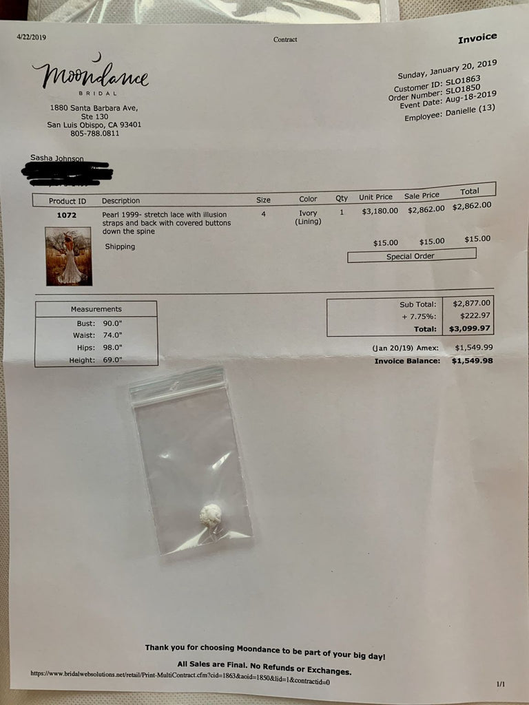 This Olvi’s 1999 gown still flawless, pristine, white and brand new. There are no defects, stains, or signs of wear. I was given a 10% discount when I purchased it at Moondance Bridal in San Luis Obispo, so I’m asking to get back exactly what I paid for it plus shipping ($40), which I also paid. This dress will ship immediately which gives you instant turnaround, as opposed to the 4 month wait. I waited 4 months for it to be specially made and shipped from Amsterdam.