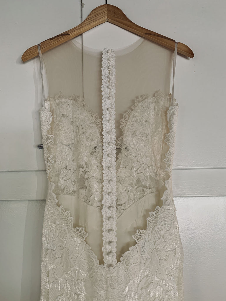 Description: A fit and flare silhouette with sheer illusion neckline. Lace and crochet on soft elastic. Fabric buttons going down the spine.