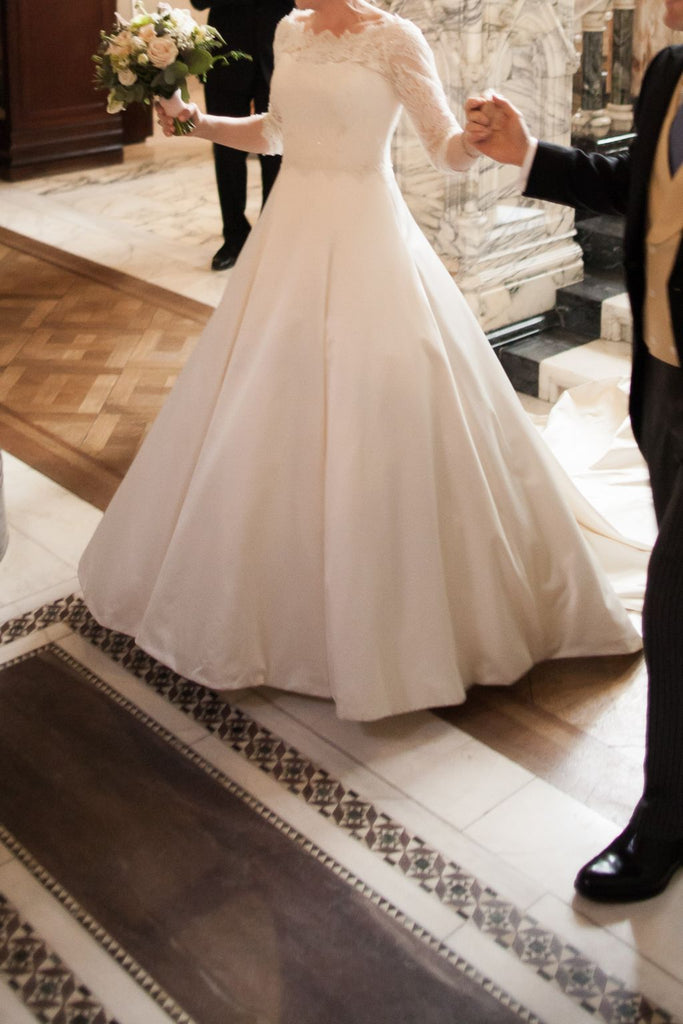 The dress has a Phillipa Lepley corset and then a Duchess satin bodice, skirt and train (made from one section of Duchess satin). For this reason the entire satin section (i.e. the full dress) was re-made, so the new dress is "as new" and unworn by anyone!! The original, Sophie Three Laces, top has then be reattached over the new dress. The lace top has 3 quarter length sleeves and hand made from three different laces.