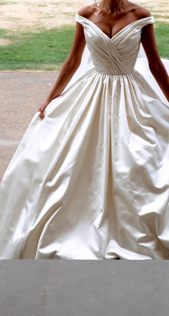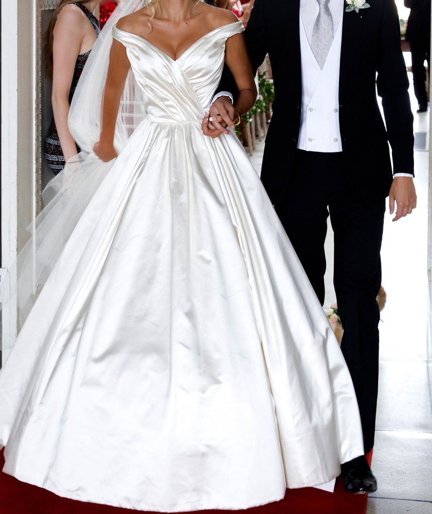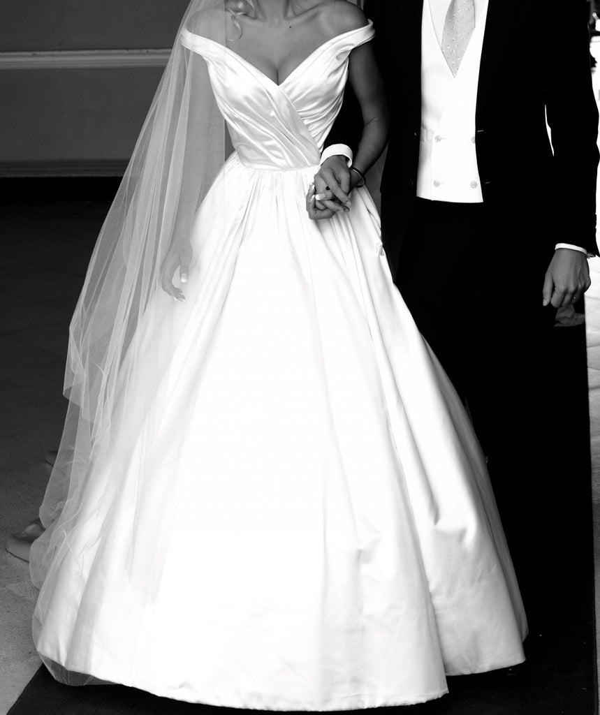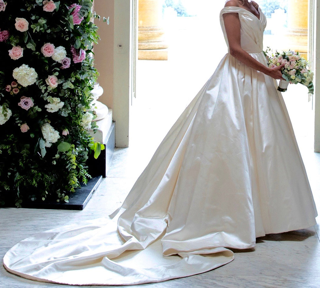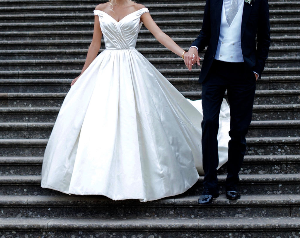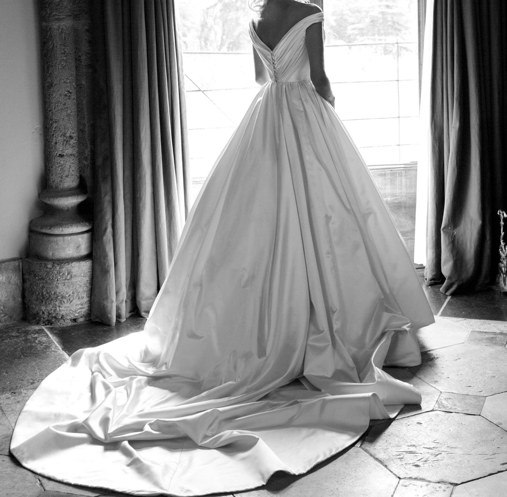 Made from the finest Italian Duchess silk satin, with hand stitching, an attached body sculpting corset, elegant Grecian crossover bodice, extra detachable petticoat for princess volume, and cathedral length train, this dress is in every detail, fit for a princess.