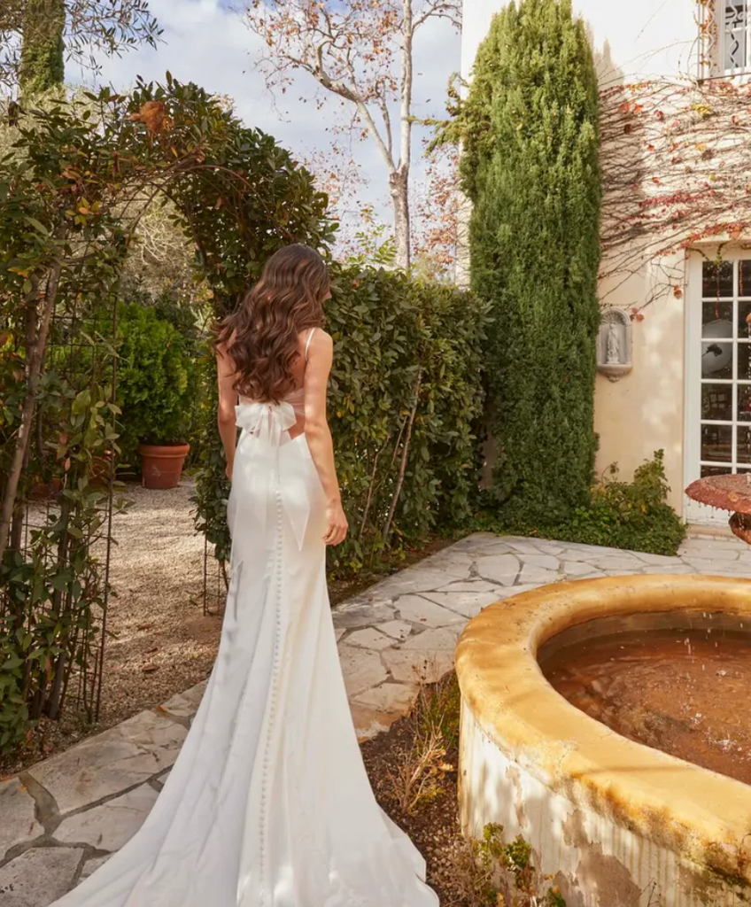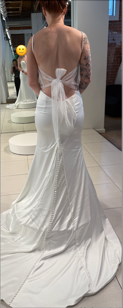 Crafted from luxurious stretch satin and delicate tulle, the Shiloh wedding dress exudes timeless glamour, designed for the bride who embodies elegance and sophistication. The satin bodice boasts a flattering sweetheart cup neckline, accentuating the bride's natural curves with a hint of allure. Thin satin straps add a touch of delicacy to the ensemble, providing comfort and ease of movement. The fitted satin skirt gracefully hugs the body, while fabric buttons trailing down the train add a classic finishing touch. Inspired by vintage Hollywood glamour, the Shiloh dress is ideal for a sophisticated city wedding or an opulent ballroom affair, capturing the essence of timeless beauty and refined style.