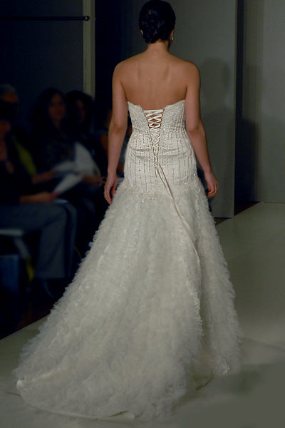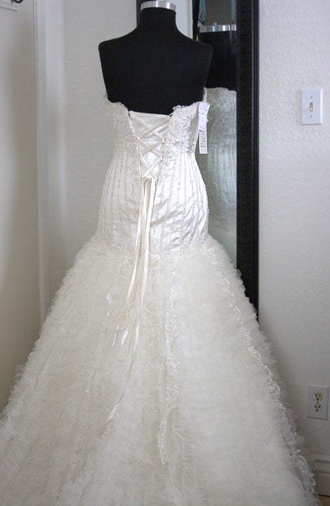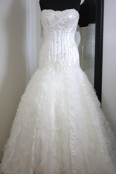 Color of the gown is IVORY. Features a super-slimming mermaid silhouette that makes you look so tall and lean! There’s also an equally flattering strapless sweetheart neckline. The bodice is adorned with hundreds shimmering Czech glass beads and genuine Swarovski crystals (literally dripping in jewels!) for a jawdropping amount of glamour and shine! We also love how these embellishments are strategically placed in vertical pattern for a visually elongating, waist-whittling effect that also minimizes the tummy and hips. Clever of Piccione to think of something so stunning yet slenderizing, too, LOL! The most showstopping feature of this dress, however, is definitely the exquisite ruffled skirt. This frilly, frothy confection is lush full of feathery tulle ruffles interspersed with lace trim, wow! You’ll look and feel as if you’re floating in on a cloud in this ruffled, meringue-like delight! Feathery, ruffled, and flamenco-inspired styles have been all the rage on the bridal runways each season (and are definitely here to stay), from designers such as Monique Lhuillier, Kenneth Pool, Vera Wang, Christos, St. Pucchi, Priscilla of Boston (especially the Melissa Sweet and Platinum collections), Enzoani, Rosa Clara, Pronovias, Ines di Santo, Allure, Liancarlo and Pnina Tornai, just to name a few! Chapel length train. Fully lined with built-in boning and support within the bodice as well as an adjustable, corset-style back. Because of the lace-ups you can customize the dress for a perfect fit. No need to spend extra money on alterations, hooray! This gown has not been altered in any way and is hence the standard length of approximately 59” from hollow to hem. It can easily be hemmed for more petite brides. Buyer pays cost of shipping (but no handling fee); all sales final. Please contact us if you have any questions or would like more pictures of this swoon-worthy designer gown.