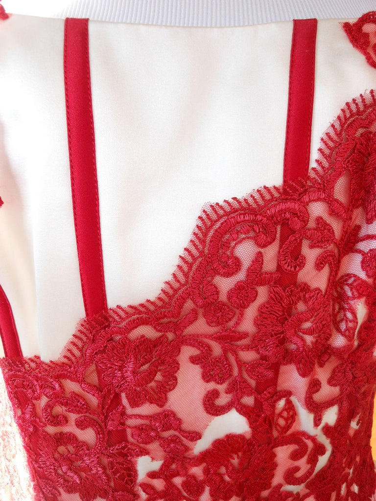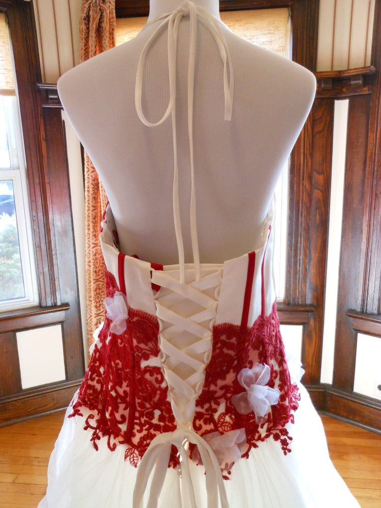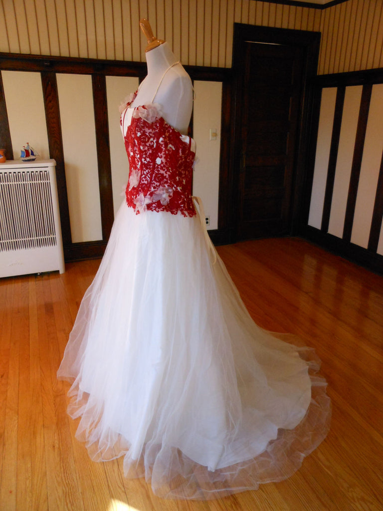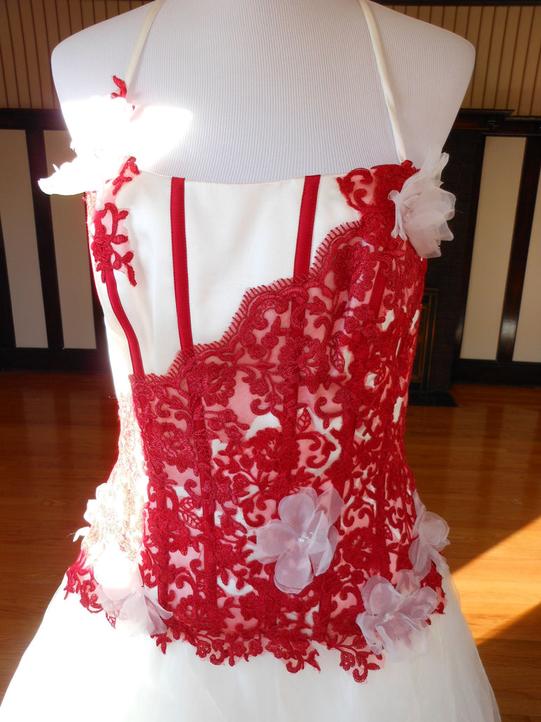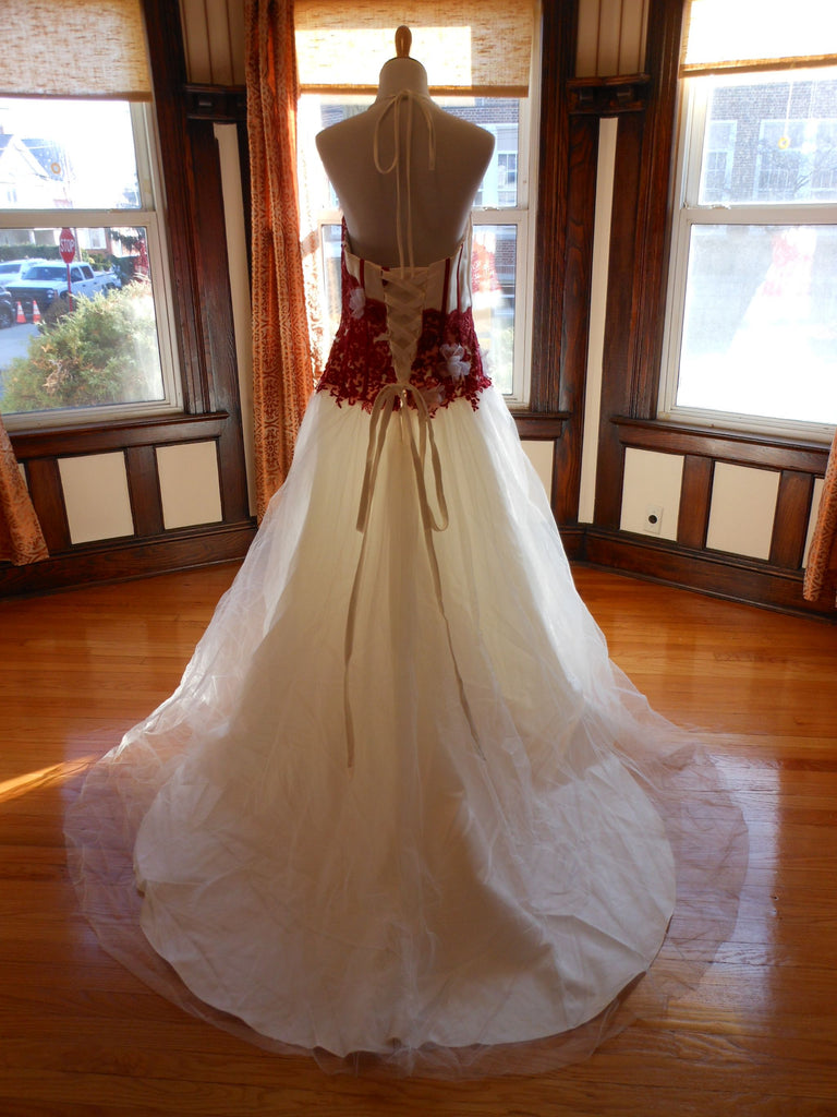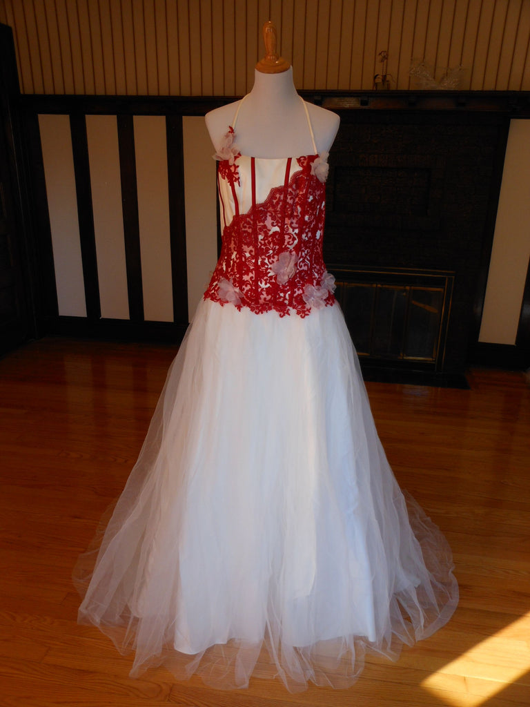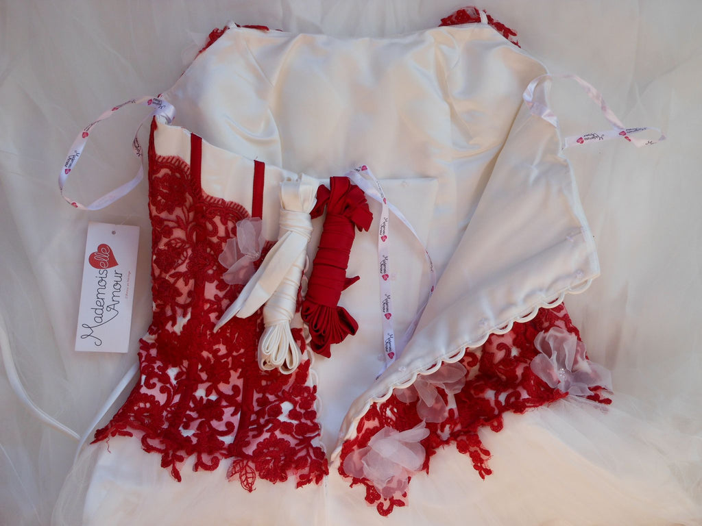 This is an Authentic Pronuptia Paris Mademoiselle Amour Bridal Wedding Dress Gown. The name of the dress is Melle Vichy. It has a gorgeous A line style with a fabulous long train. The bodice is made of high grade satin and embellished with exquisite floral lace and 3D flowers. The bodice also has boning to build a perfect shape. The skirt is made of high grade tulle. It comes with two sets of lace for the corset back: Ivory and Bordeaux. This dress is brand new in great condition with the original label and tags. It was never worn.
