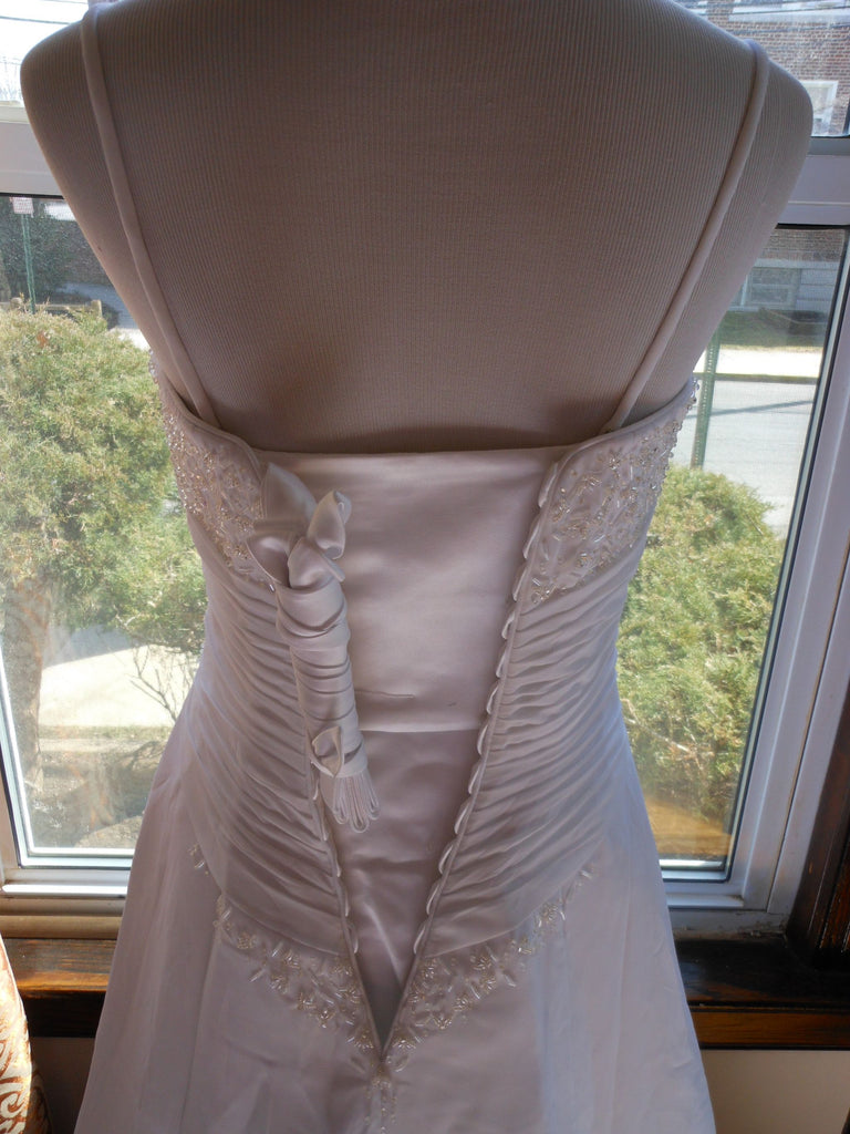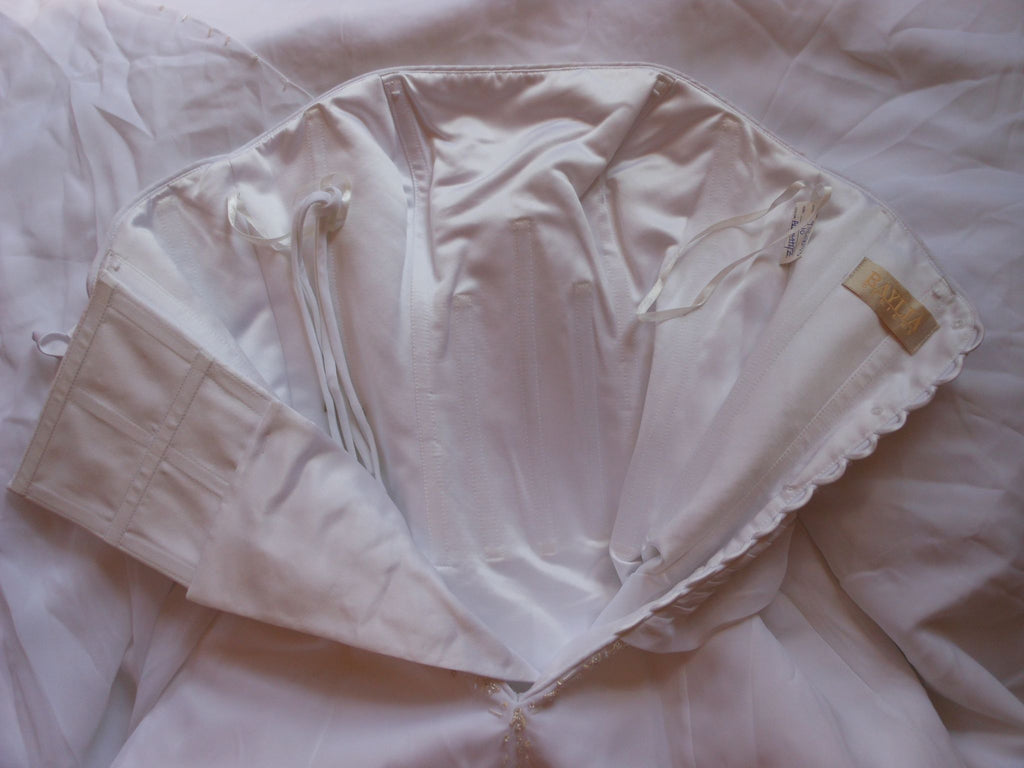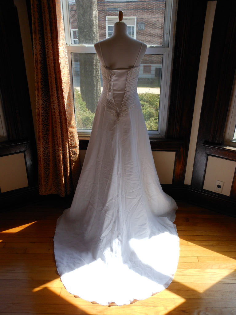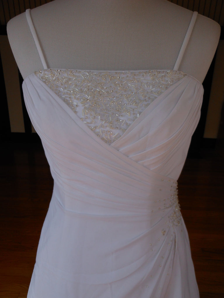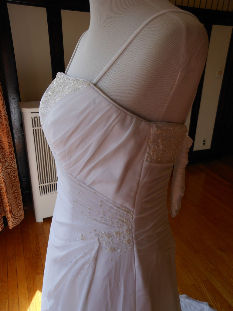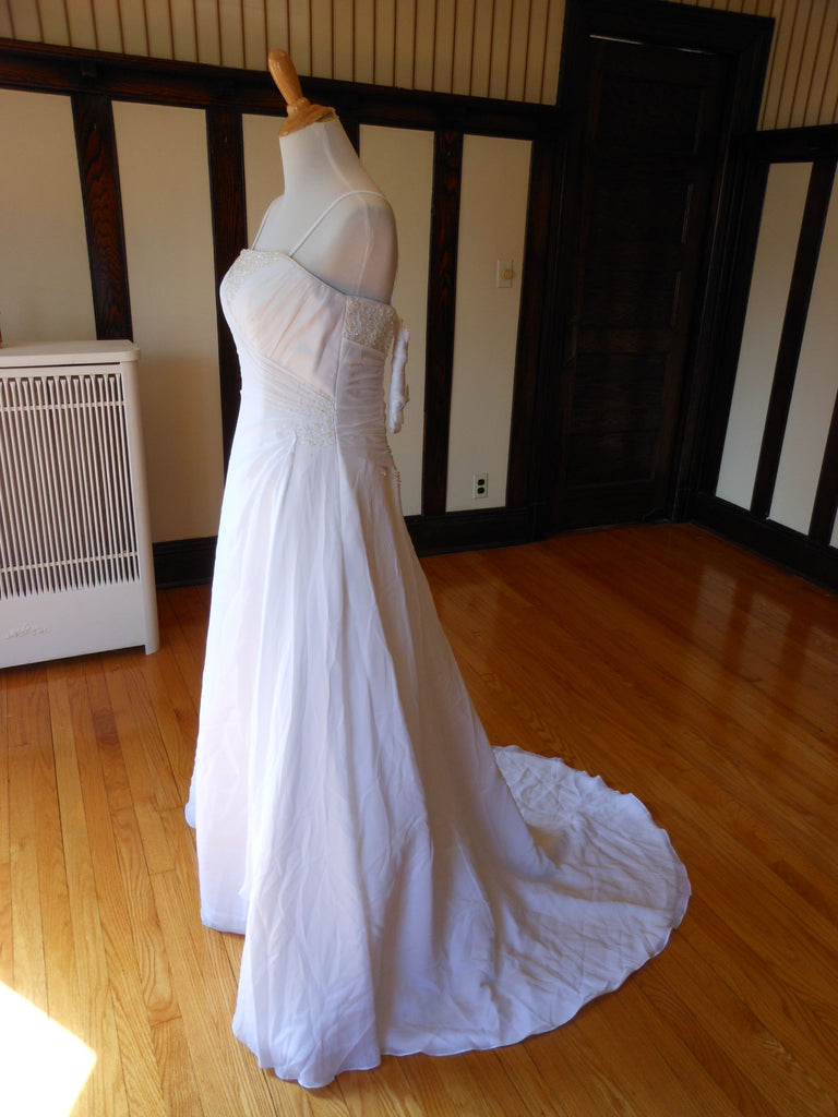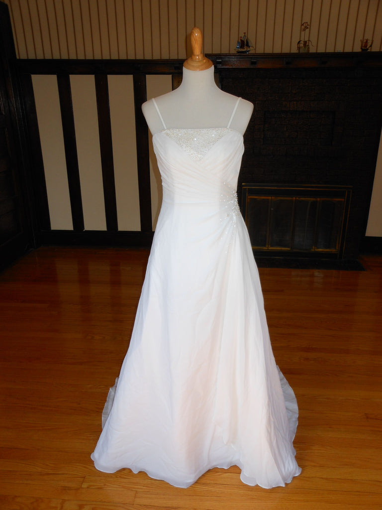 This is an Authentic RAYLIA DESIGNS Bridal Wedding Dress Gown. The style number of the dress is 90C08033. It has a gorgeous A line style with a fabulous chapel train. The dress is made of high grade chiffon and embellished with exquisite sparkling beads/sequences on the bodice. The bodice also has boning to build a perfect shape. The skirt has netting petticoat inside to support a full shape. It comes with removable spaghetti straps. This dress is brand new in great condition with the original label and tags. It was never worn.