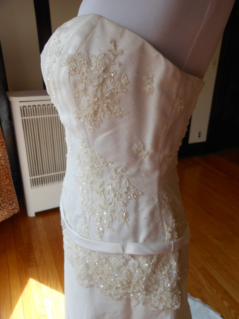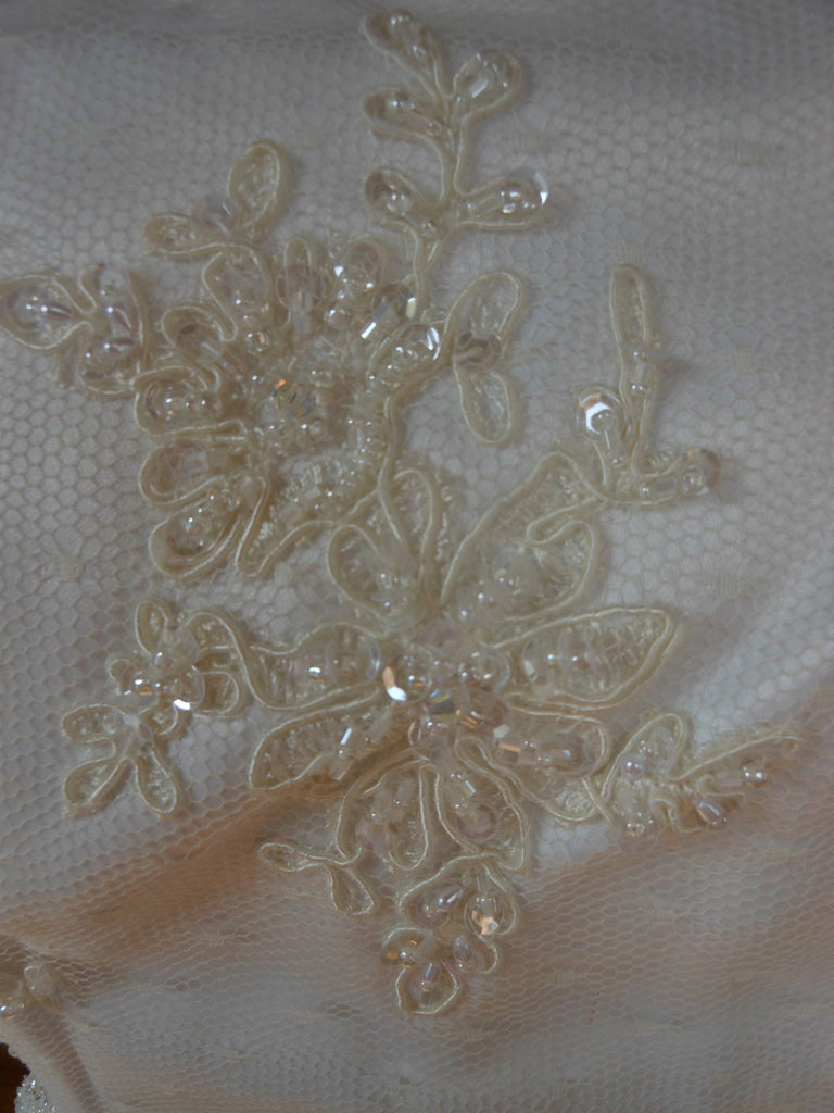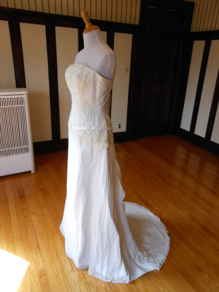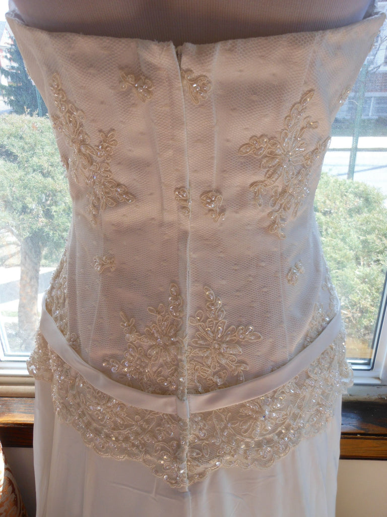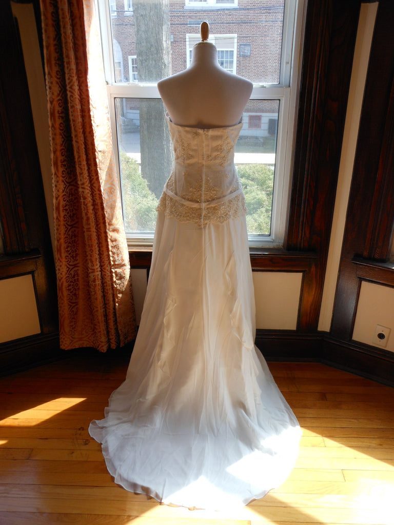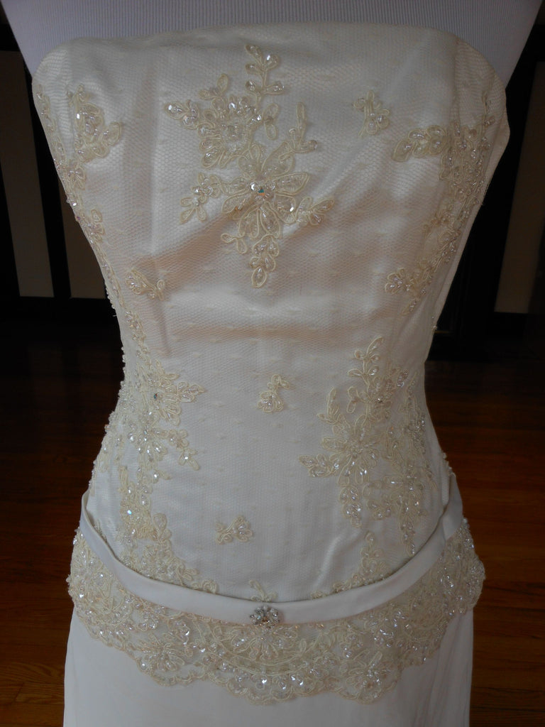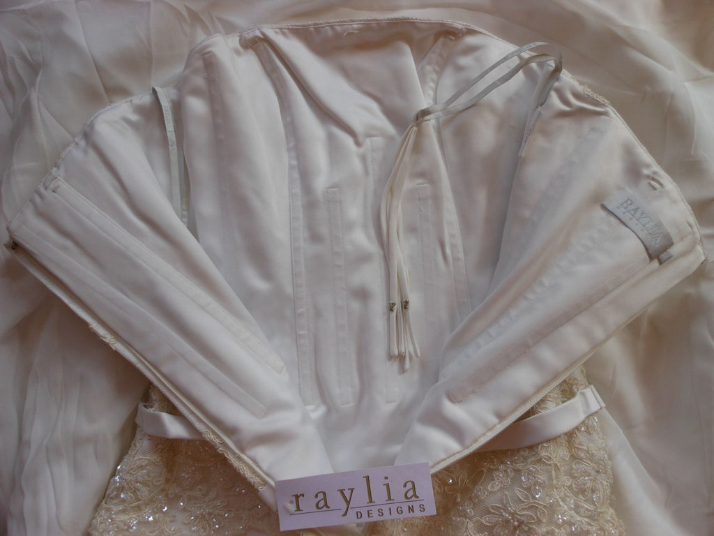 This is an Authentic RAYLIA DESIGNS Bridal Wedding Dress Gown. The style number of the dress is W324. It has a gorgeous A line style with a fabulous chapel train. The dress is embellished with exquisite floral lace on the bodice, and sparkling beads/sequences on top of the lace. It is decorated with stunning crystals and sparkling beads/pearls in the center of the belt. The bodice also has boning to build a perfect shape. This skirt is made of high grade chiffon. It comes with removable spaghetti straps. This dress is brand new in great condition with the original label and tags. It was never worn.