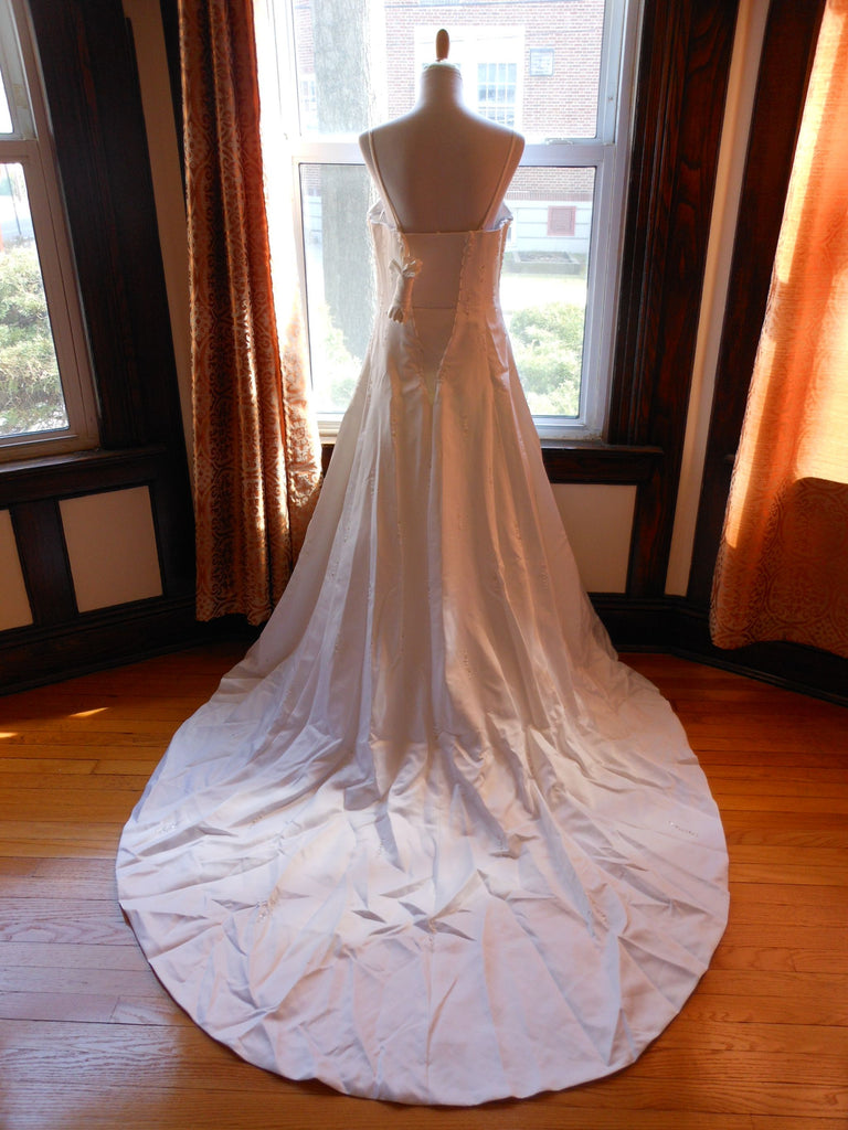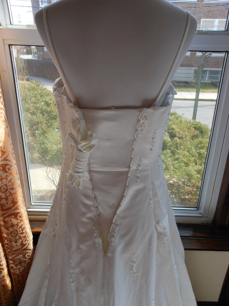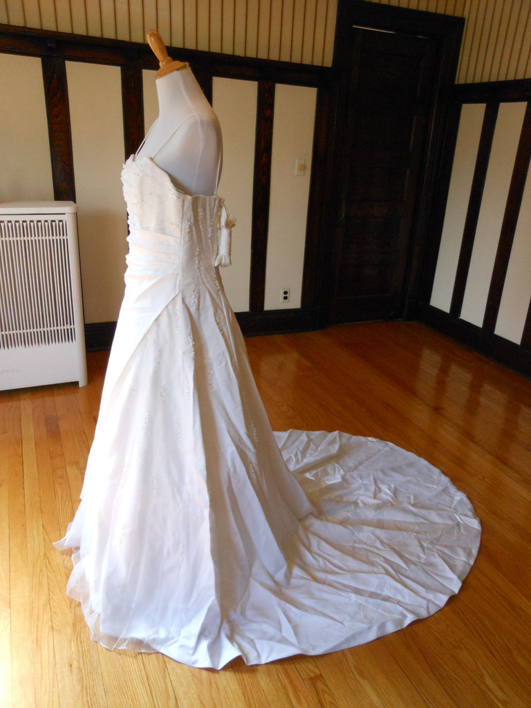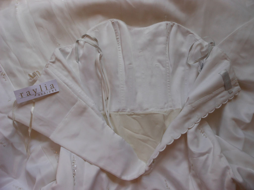 This is an Authentic RAYLIA DESIGNS Bridal Wedding Dress Gown. The style number of the dress is W352. It has a gorgeous A line style with a fabulous long train. The dress is embellished with sparkling beads/sequences, and also exquisite sequences/pearls to build beautiful 3D flowers. The bodice also has boning to build a perfect shape. The skirt has netting petticoat inside to support a full shape. It comes with removable spaghetti straps. This dress is brand new in great condition with the original label and tags. It was never worn.