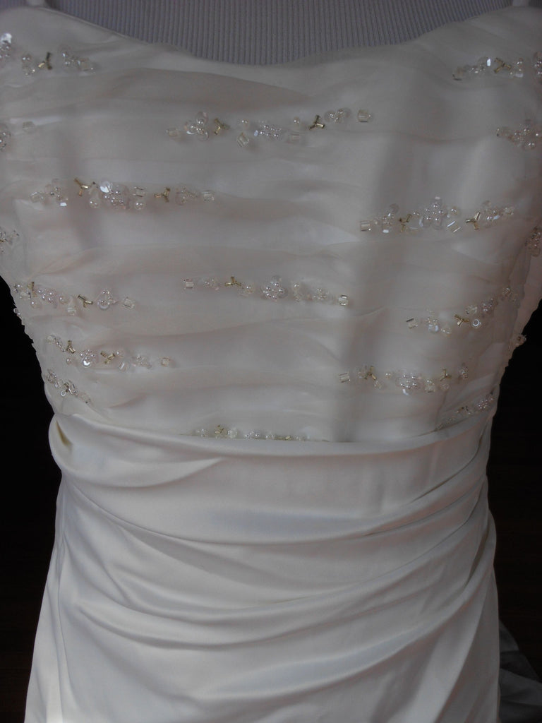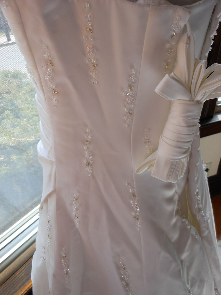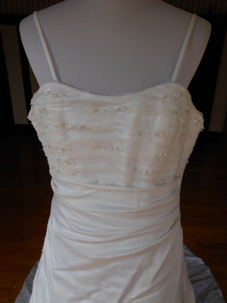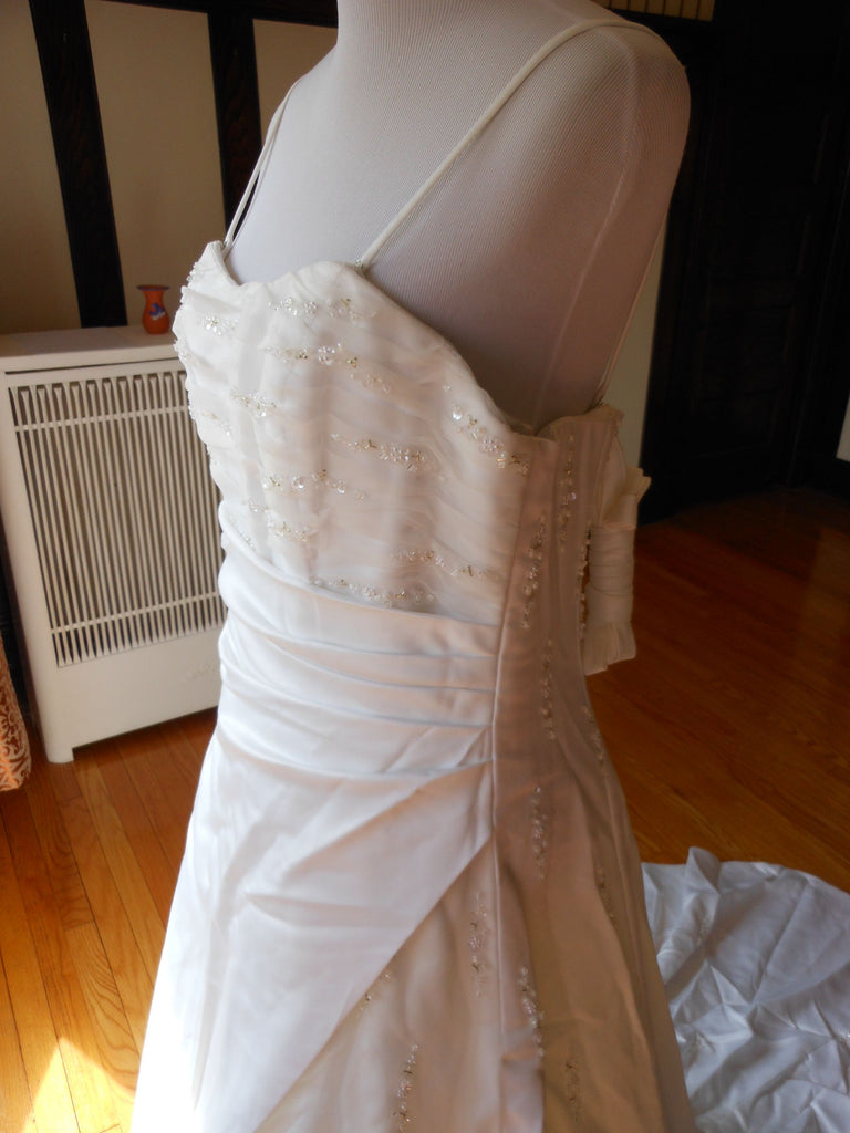 This is an Authentic RAYLIA DESIGNS Bridal Wedding Dress Gown. The style number of the dress is W352. It has a gorgeous A line style with a fabulous long train. The dress is embellished with sparkling beads/sequences, and also exquisite sequences/pearls to build beautiful 3D flowers. The bodice also has boning to build a perfect shape. The skirt has netting petticoat inside to support a full shape. It comes with removable spaghetti straps. This dress is brand new in great condition with the original label and tags. It was never worn.