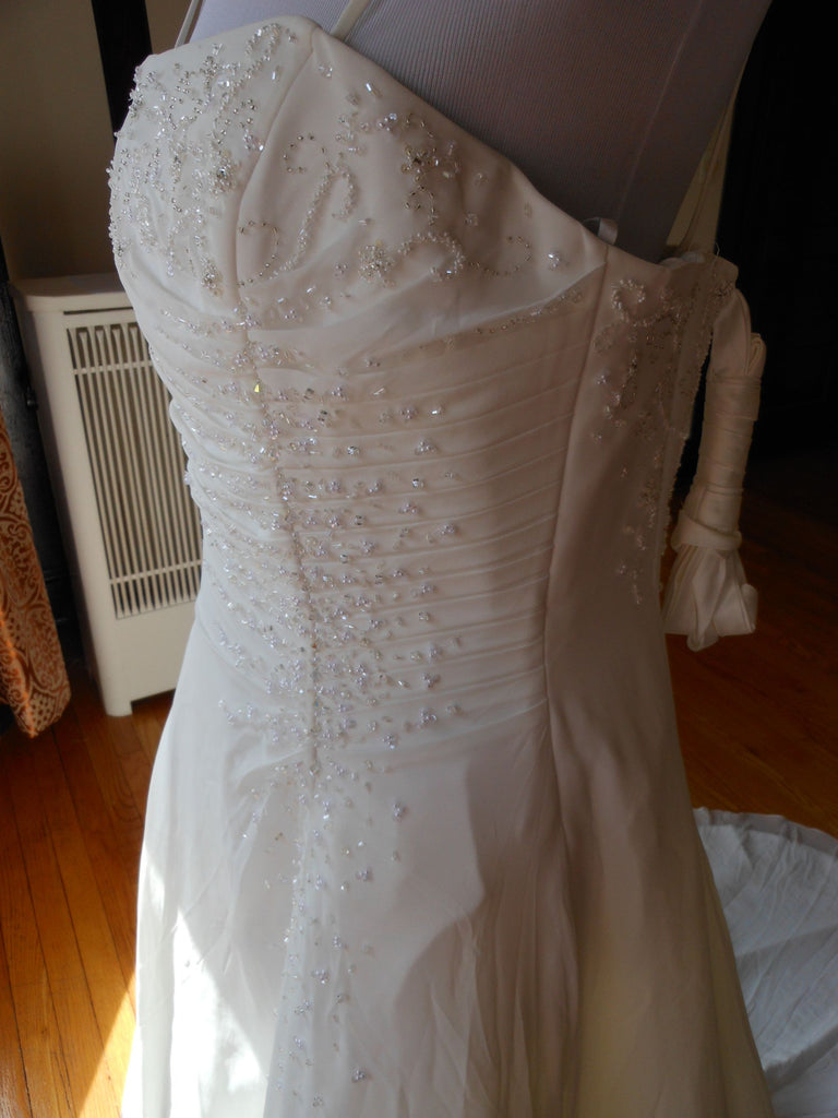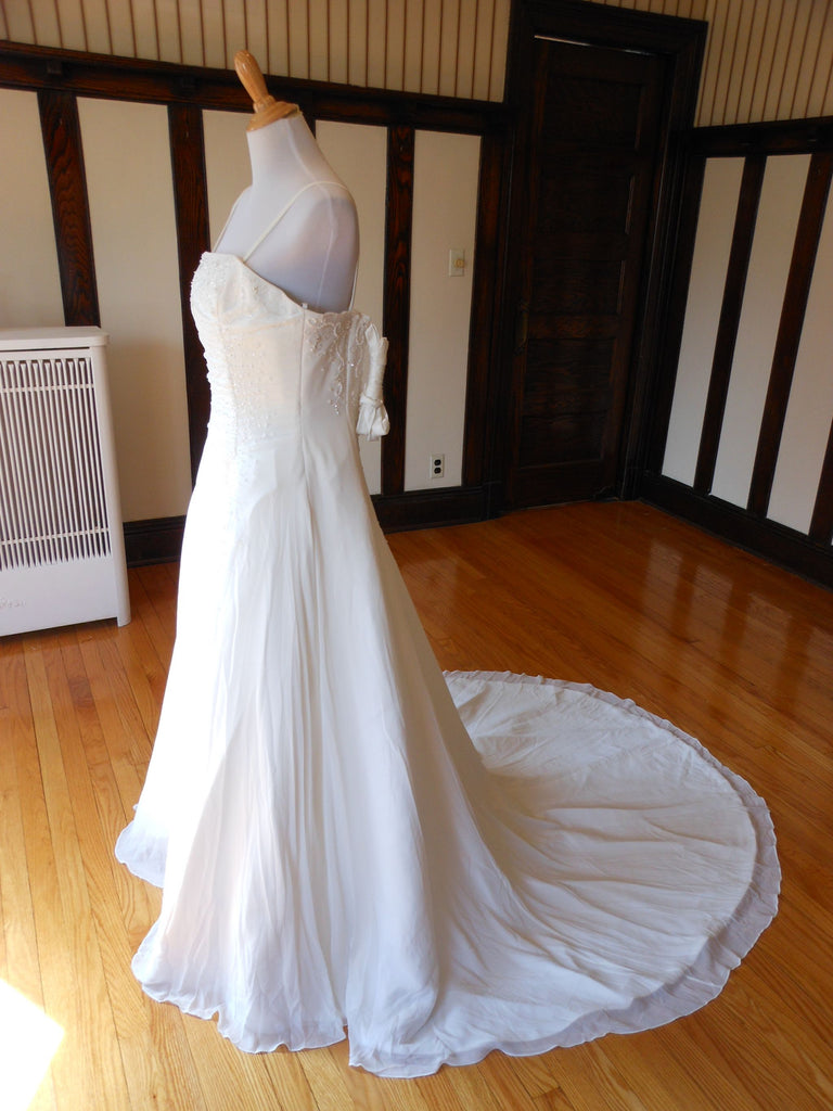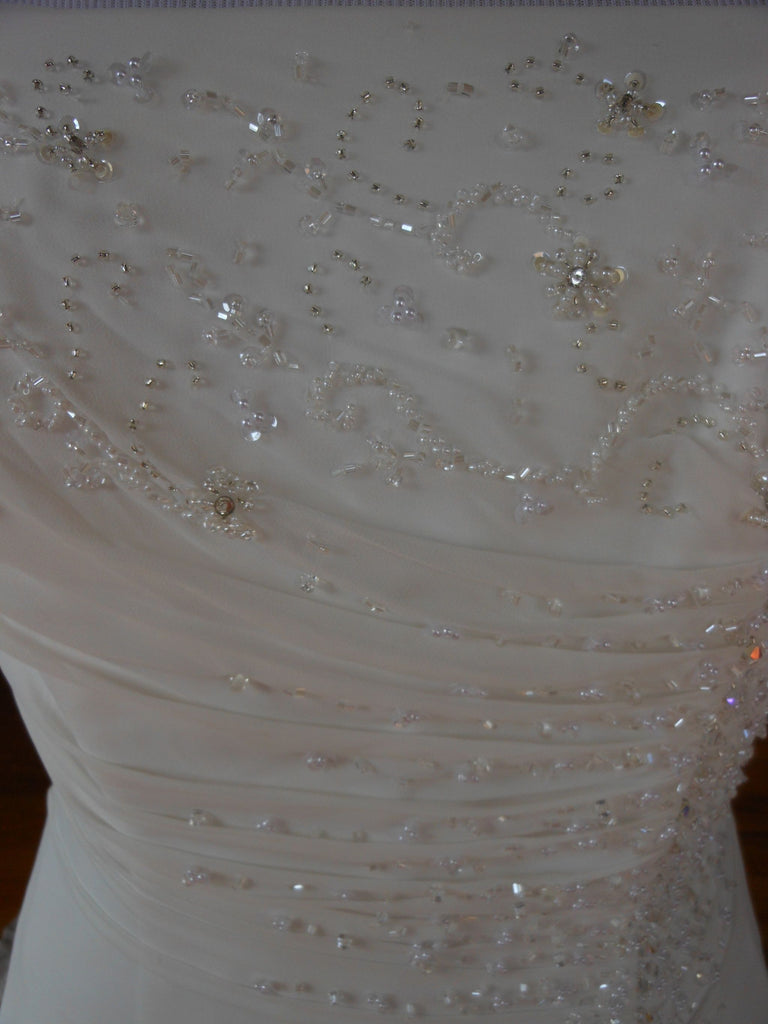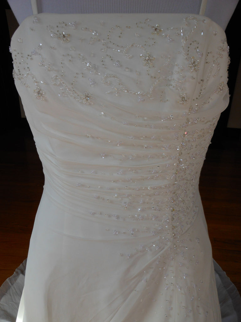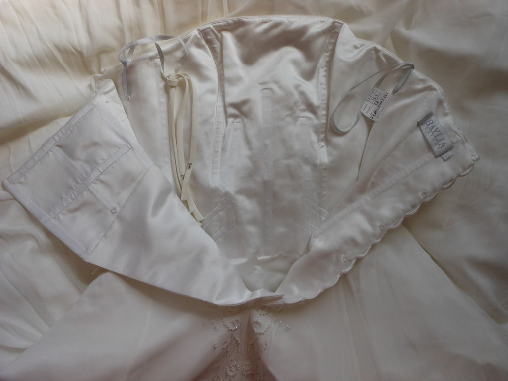 This is an Authentic RAYLIA DESIGNS Bridal Wedding Dress Gown. The style number of the dress is W364. It has a gorgeous A line style with a fabulous long train. The dress is made of high grade chiffon, and embellished with stunning crystals and exquisite sparkling beads/sequences on the bodice. The bodice also has boning to build a perfect shape. The skirt has netting petticoat inside to support a full shape. It comes with removable spaghetti straps. This dress is brand new in great condition with the original label and tags. It was never worn.