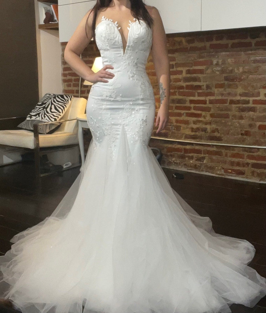 *This dress does not fit the model pictured above explaining the slight distortion of the mesh in the back typical of gowns too small to fit. There are no alterations done to the gown, this is a brand new dress from the bag only worn once for pictures. The dress will be packaged with tags still intact.*