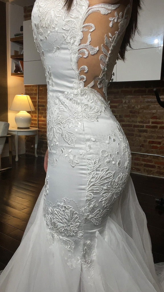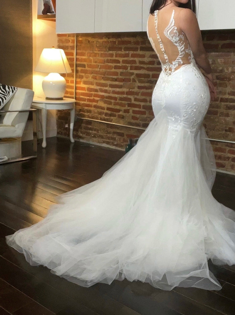Unique and Beautiful mermaid style gown; from the illusion mesh detailing the angel wing embroidery to the tufts of tulle separated into a distinctive pattern and shape.