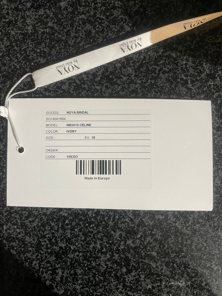 The dress is supported by an illusion mesh, there is an invisible zipper in the back decorated with pristine soft ivory buttons that go up the spine. The train of the gown is a moderate length but can still be bustled to the bride's convenience.