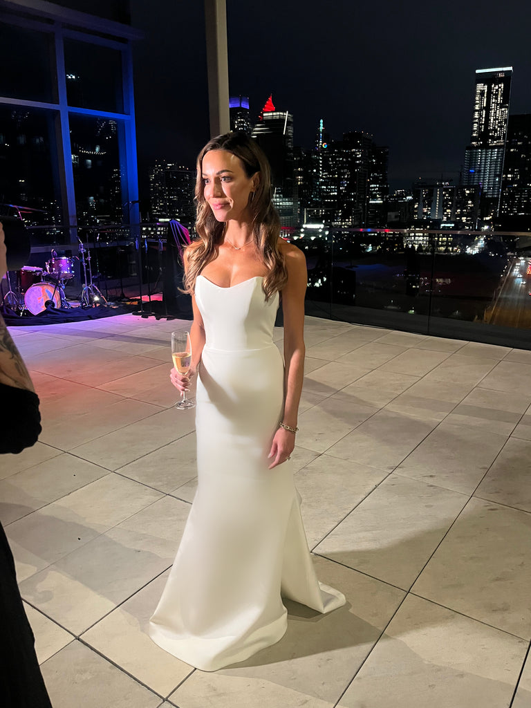 The boned bodice offers incredible structure and comfort — it stays perfectly in place without tugging. The sculpted neckline flatters the collarbone, while the fluted skirt and slight train add quiet drama. The silk feels thick yet fluid — luxurious to the touch and moves beautifully in photos.