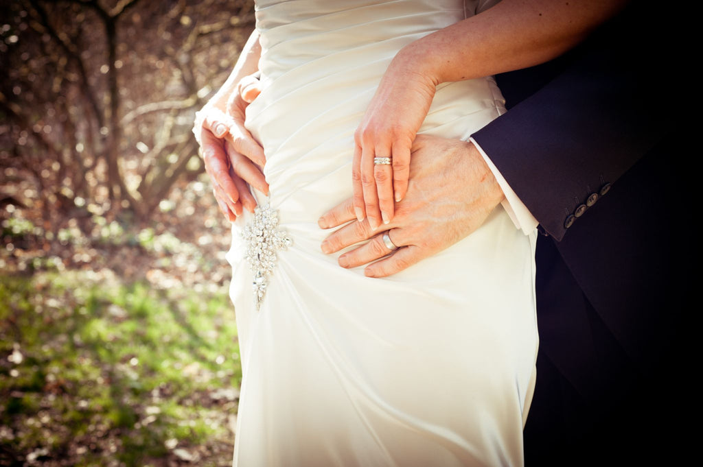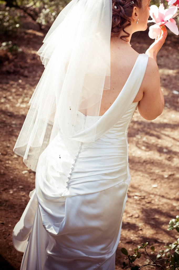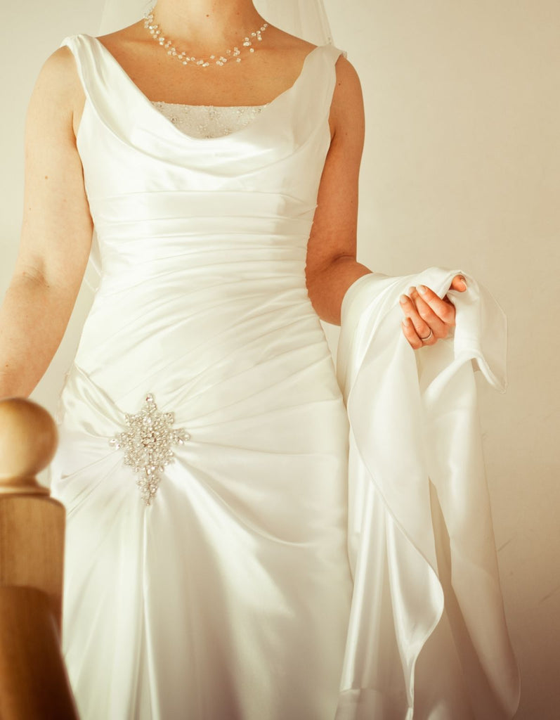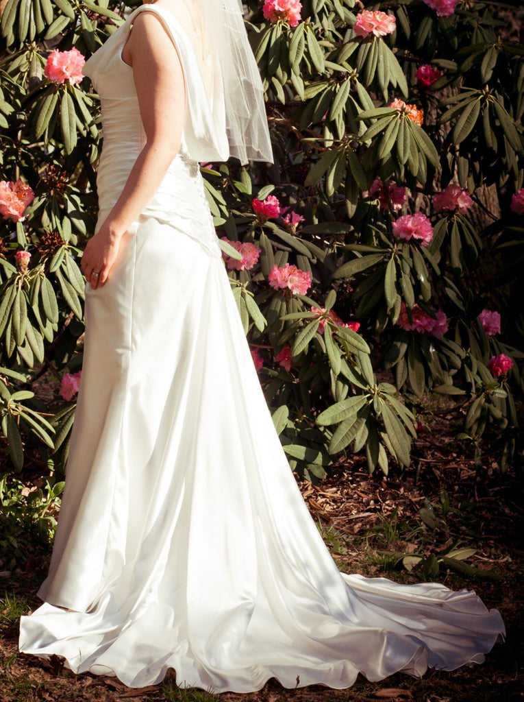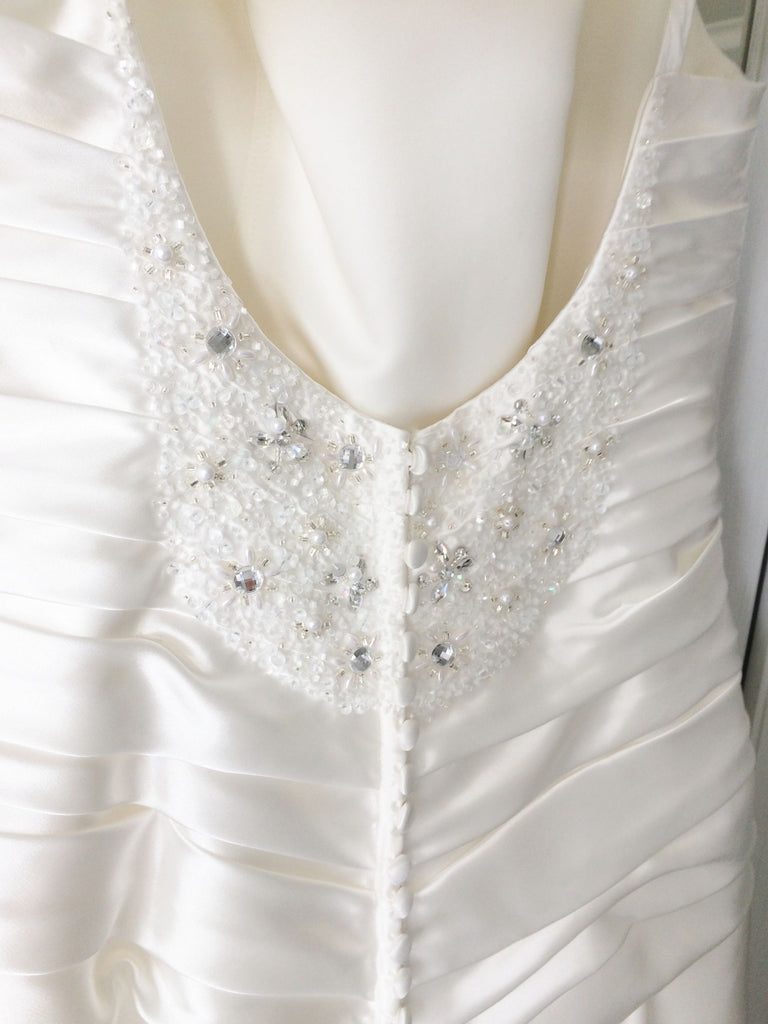 The dress has an inner bodice and a button under the skirt to hold up the train after the ceremony. There is a satin stole wrap included, which has never been worn.