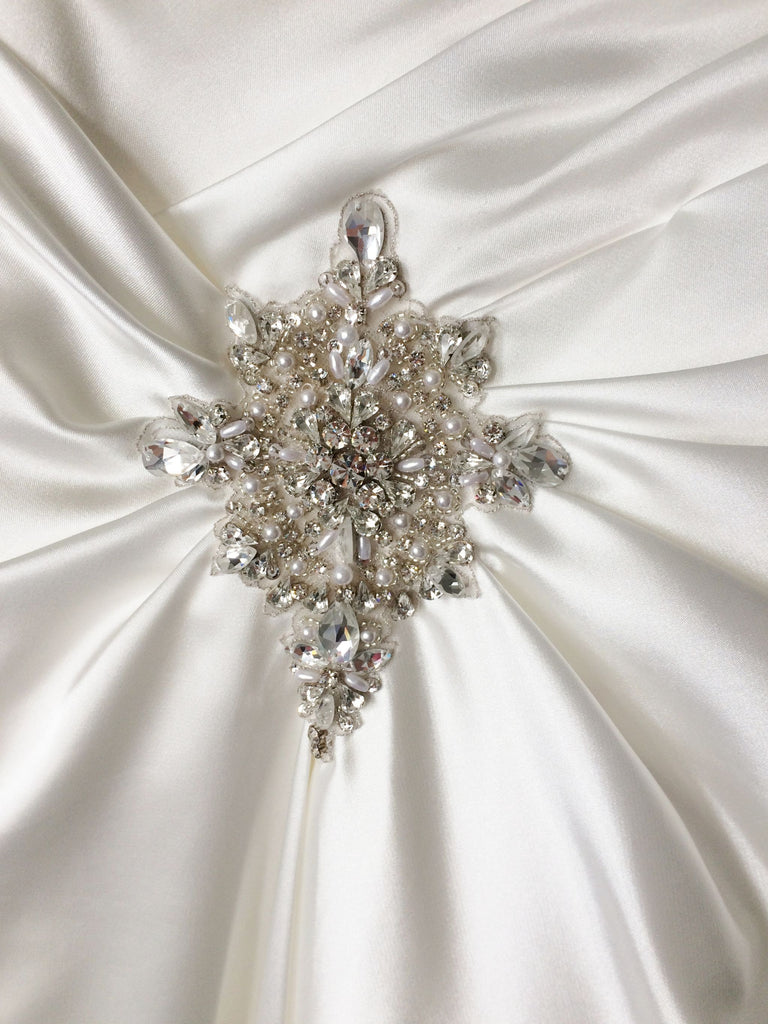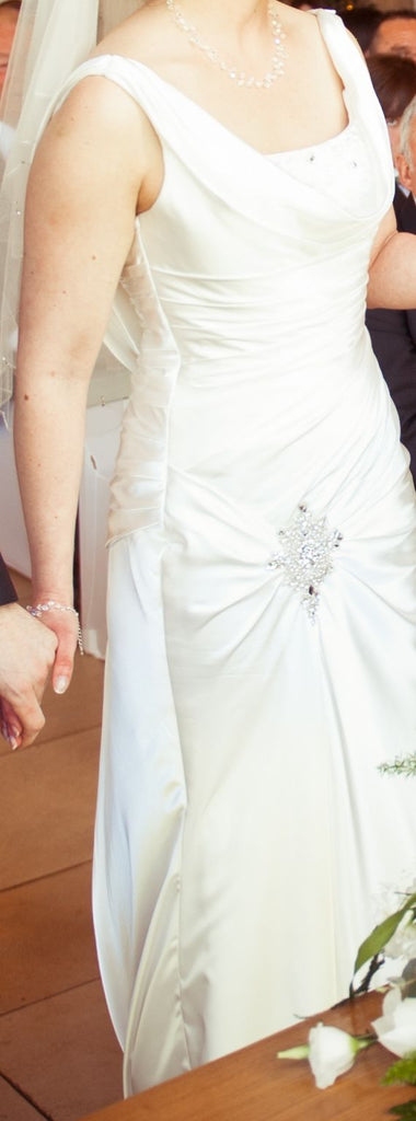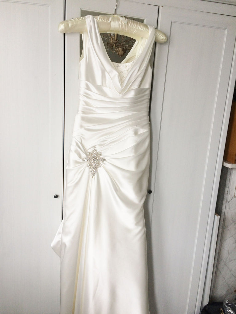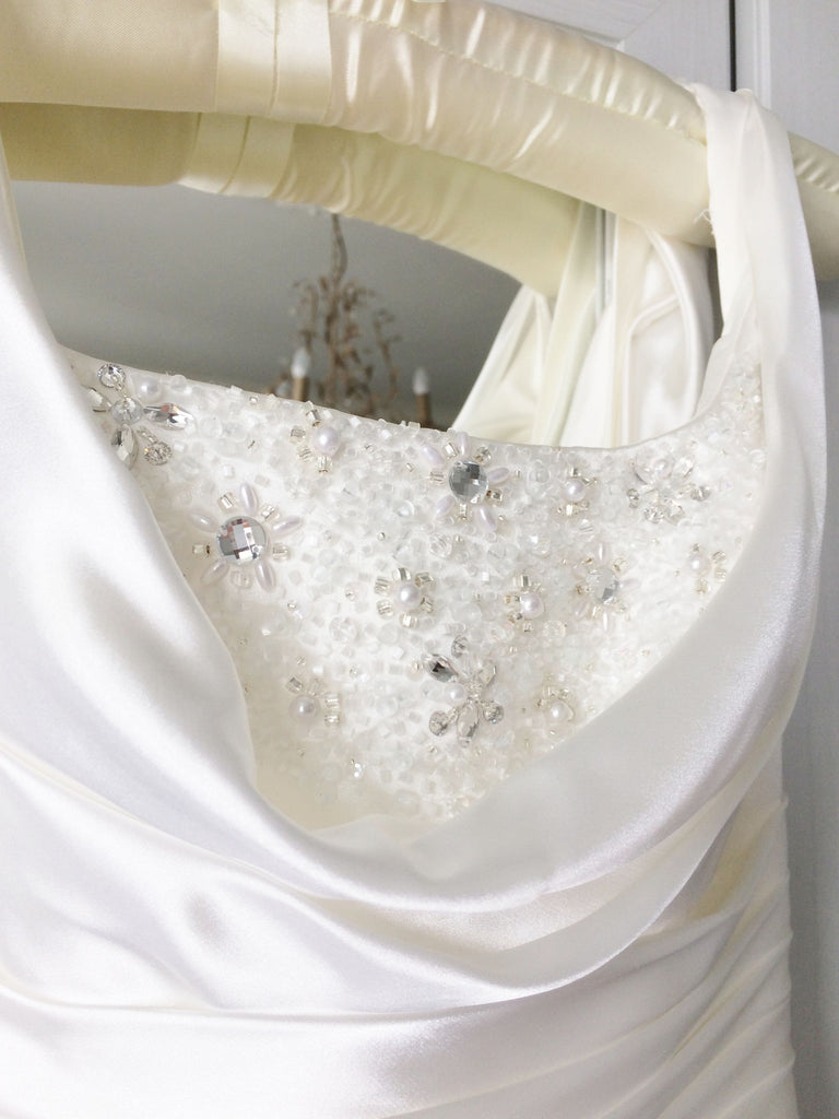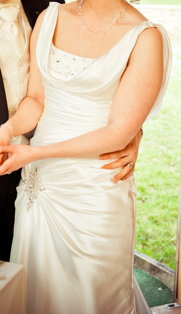 The cowl neck detail of the dress has delicate bead work, which sparkles in the light. The hip of the dress has a diamanté broach detail. The back has a line of satin button detailing that flatters the hips and bottom.