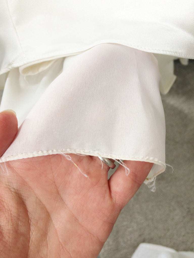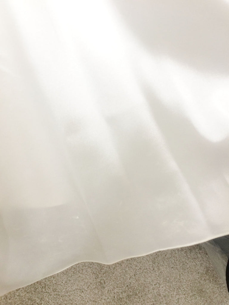 I had the dress professionally cleaned immediately after the ceremony. It has only been worn once in dry weather and is in very good condition. There are some minor pulls on the hem and minor marks on the underside of the train, which you can only see if you hold the dress very close in good light, they would not be visible when the dress is on.