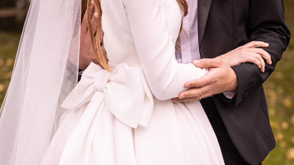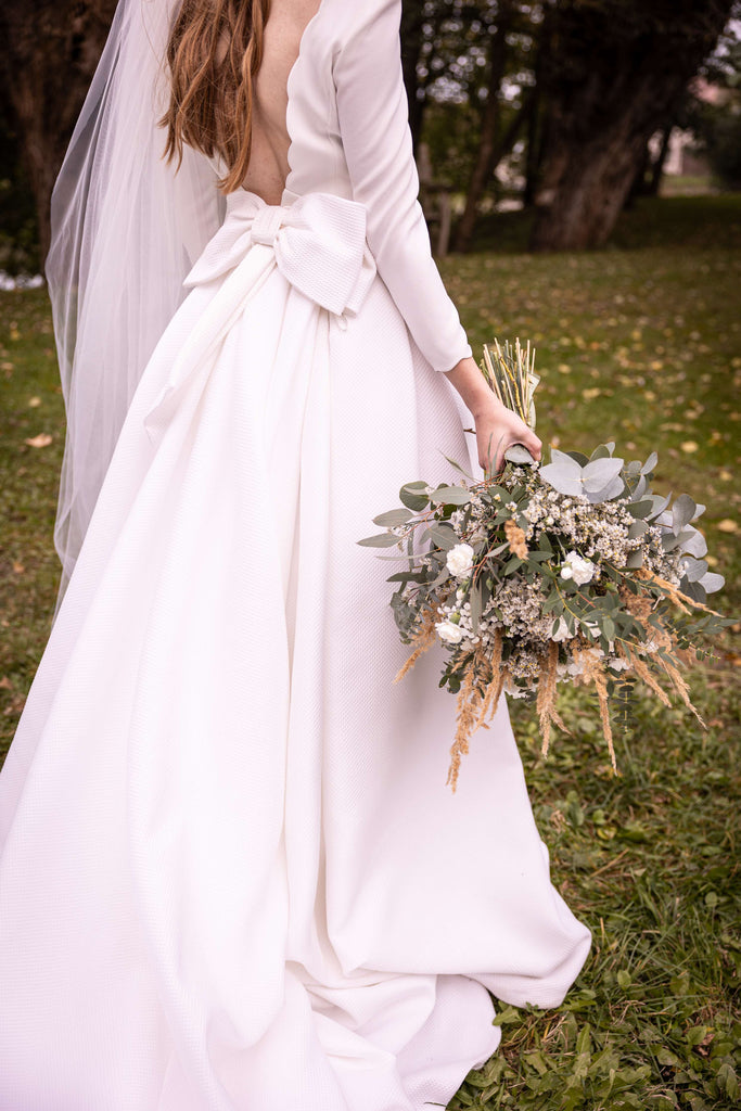 A beautiful bow at the back adds a refined, romantic touch. The dress has a natural short train, which can be pinned up using discreet loops and ties, allowing the hem to be floor-length if preferred. In addition, it comes with a detachable overskirt/train that attaches under the bow using small hidden hooks and loops. Thanks to this thoughtful design, the dress offers three different lengths: