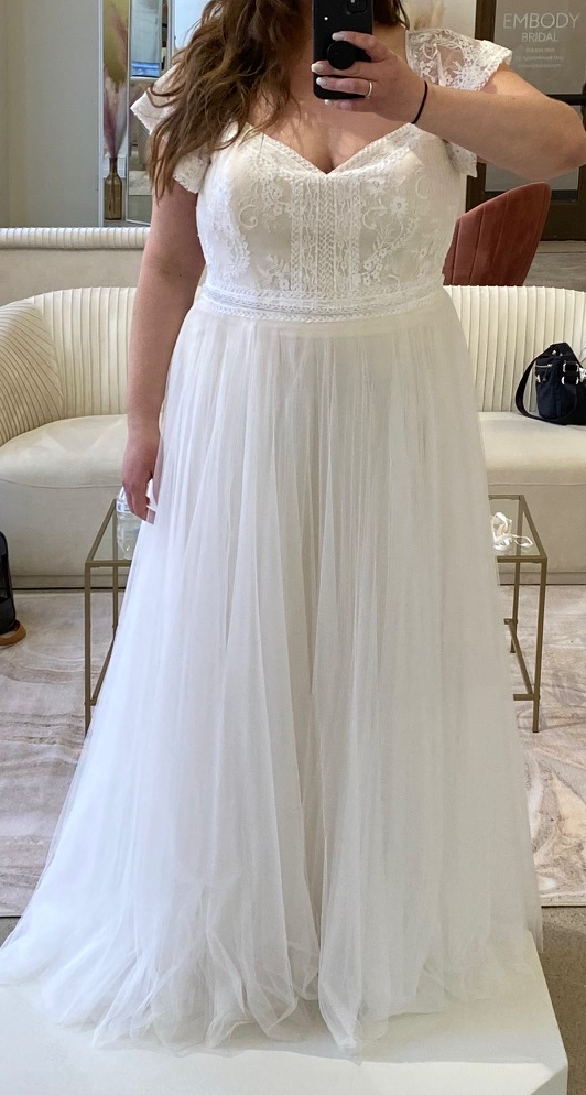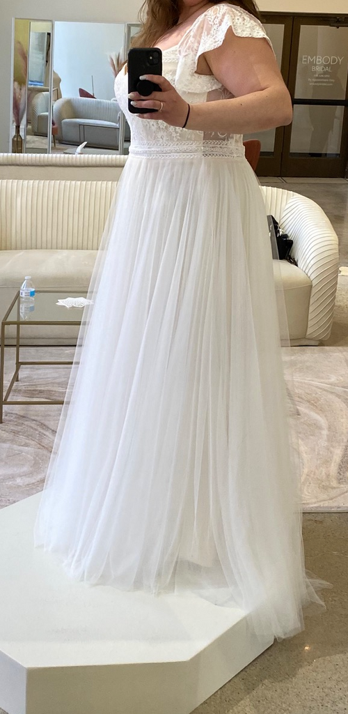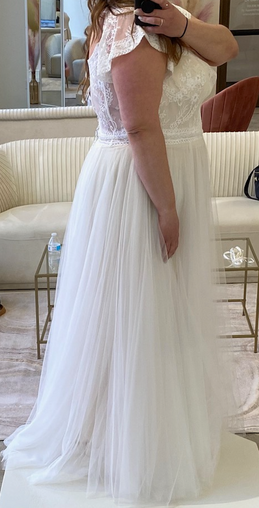 This beautiful boho lace wedding dress is the Flirtini style by Roz la Kelin from the Indie Glam Plus collection. I bought this dress in 2022, it has not been professionally cleaned and is unaltered as it is brand new and never worn.