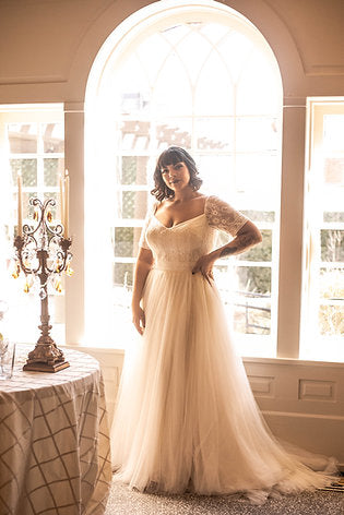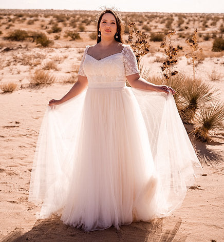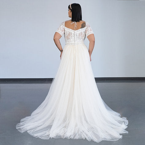 It is a Boho lace wedding dress featuring amazing lace back details with buttons, built-in beaded belt, an A-line silhouette, v-neck sweetheart necline, tulle skirt with champagne colored under layer.