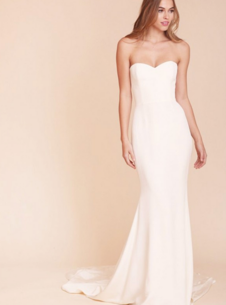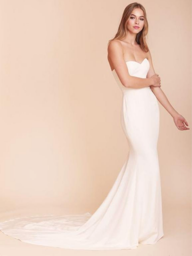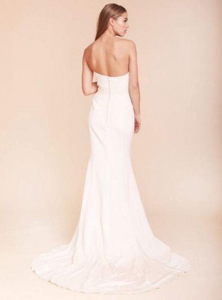 Sarah Janks - Bella, a straight-cut gown whose crepe silk falls beautifully over a molded corset to skim the hips and flare into a dramatic kick train.