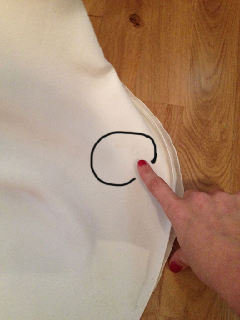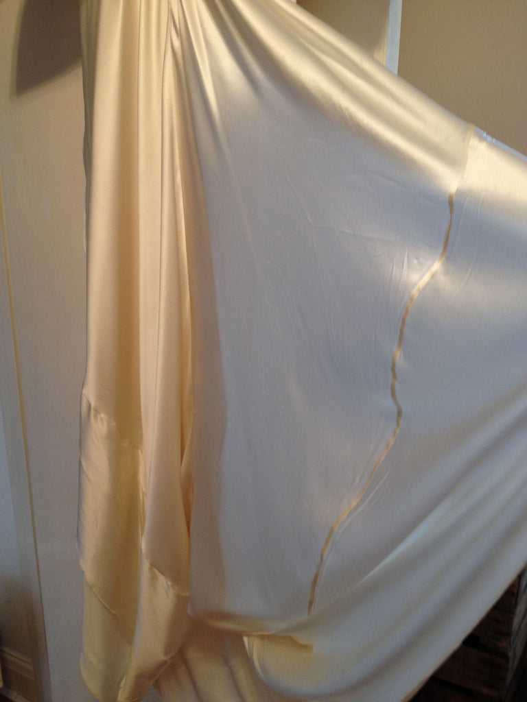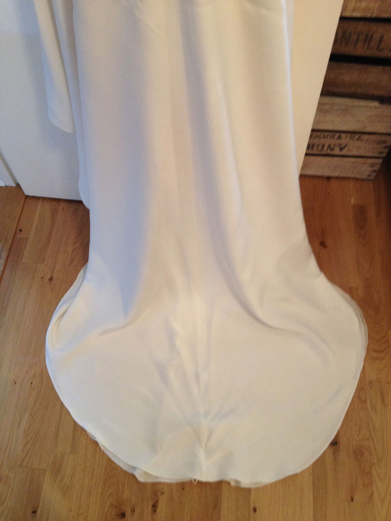 I have had this dress professionally clean. Due to the delicate silk material it will need steaming as the long train get creased in the dress bag, there are no stains on the underneath of the silk train, there are 3 very very minor stains on the dress, I can detail all of these and supply photos, these are not noticeable at all, but I like to list everything. I can send loads of additional photos of the dress upon request.