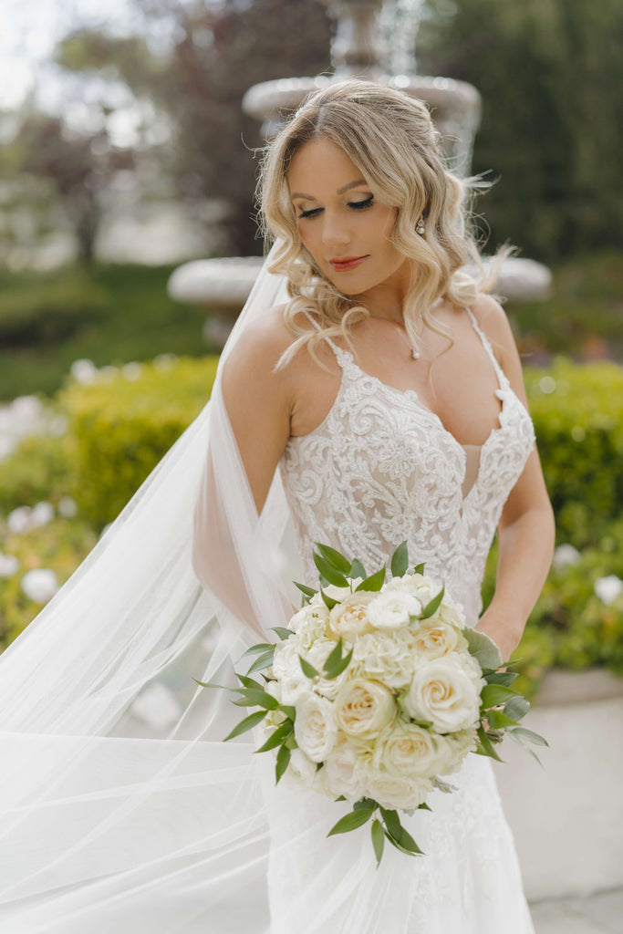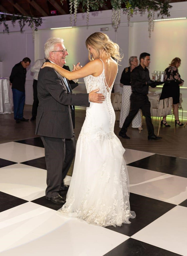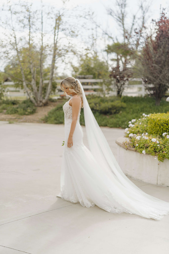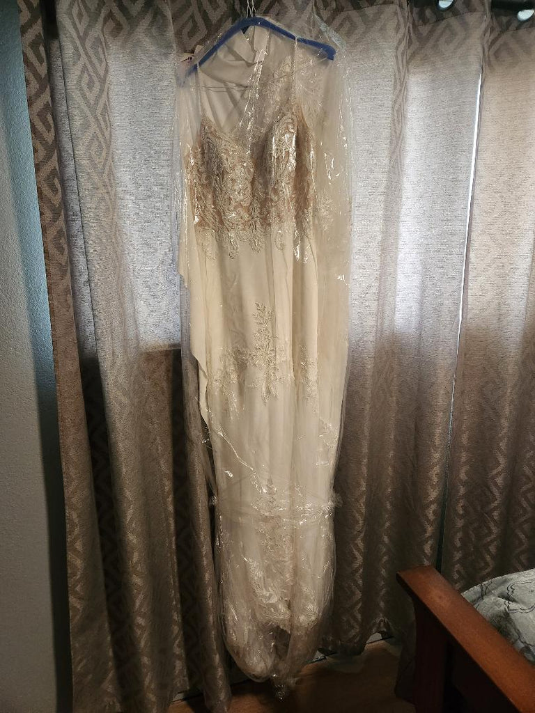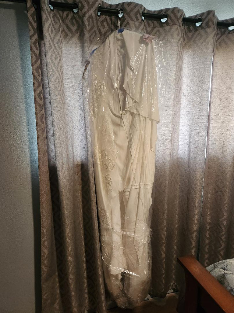 Originally purchased from LUV Bridal in Los Angeles in Dec 2023 (delivered in March, my wedding was in April 2024). This is an Australian designer, so the sizing is different - per the designer, it is an Australian size 10 that was then altered. A 5 button bustle has also been added. I am an American size 4-6 - 34"-30"-38", and 5'7". I wore a Nueboo that added 2 cup sizes - so there's room if you have a larger bust. In order to get the lace at the back of the dress to fit, the keyhole detail at the back has a crossover, with two hook and eye closures - but the rest of the dress is a zipper and super easy. The button details are just for show.The bottom of the dress is multi-layered with lining, crepe and a lace overlay.
