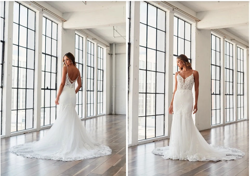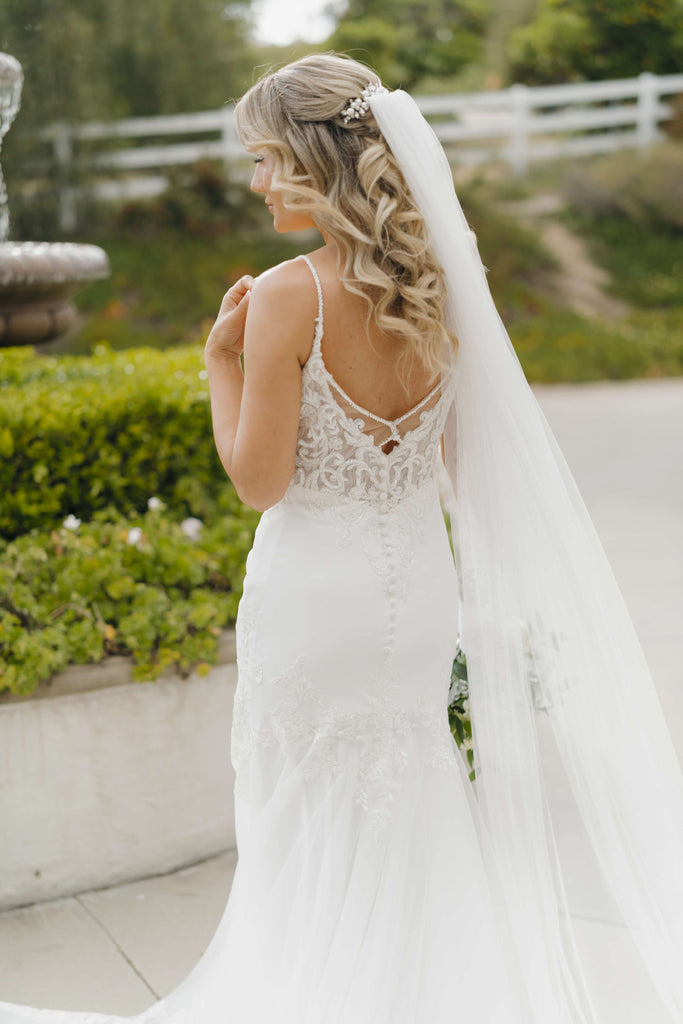 Spaghetti strap, fit and flare, mermaid, lace detail, plunge neckline, low back, keyhole detail. Crepe and lace - minimalistic and sexy. The way the flare at the bottom "floofs" around your feet as you walk is gorgeous.
