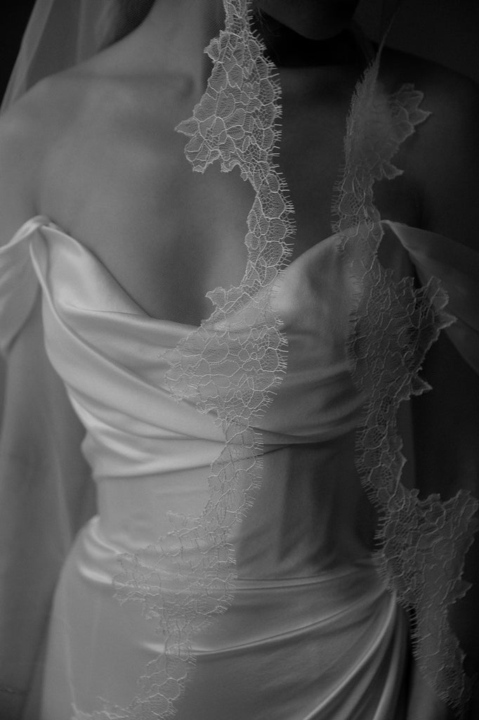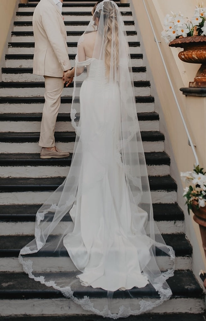 Both wedding dress and veil were professionally cleaned and preserved immediately after the wedding by Elegance Preserved in Los Angeles, one of the most trusted bridal gown preservation specialists.
