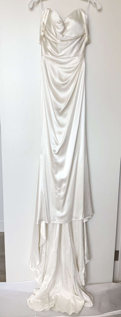 Design: Strapless gown with a romantic interior corset structure and a sweeping train.