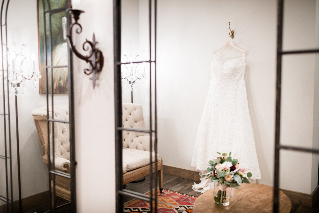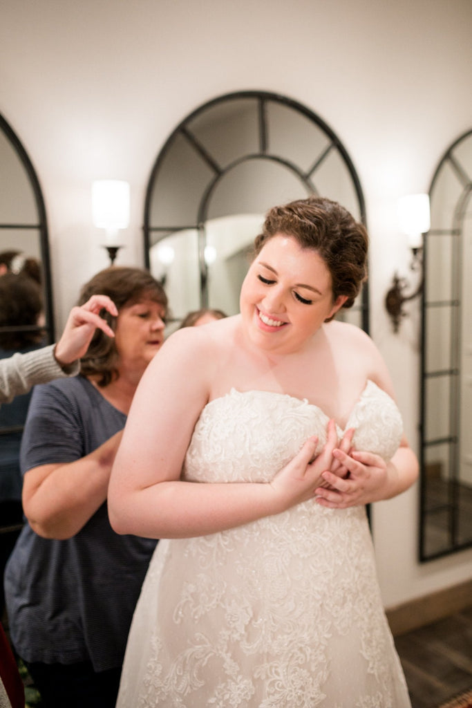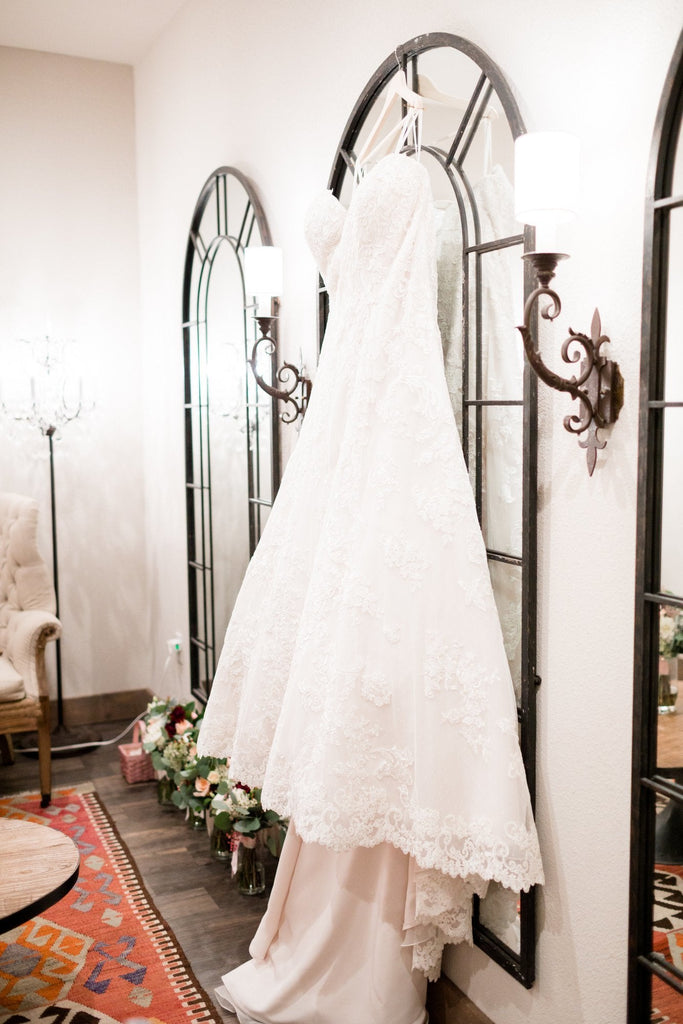 The dress received minor alterations from a professional atelier. The bust was brought in a couple of inches from the original size (from a 42.5 bust to a 40.5) and a supporting strap with clasps was added. The clasps allow for the bust to be pulled in tighter if needed (think similar to bra clasps). Additional padding inserts were also added for the bust. In other words, I was not busty enough to fill out the original size, so the atelier brought the bust in and created additional support to help me fill out the dress more/lift up the ladies a little bit!