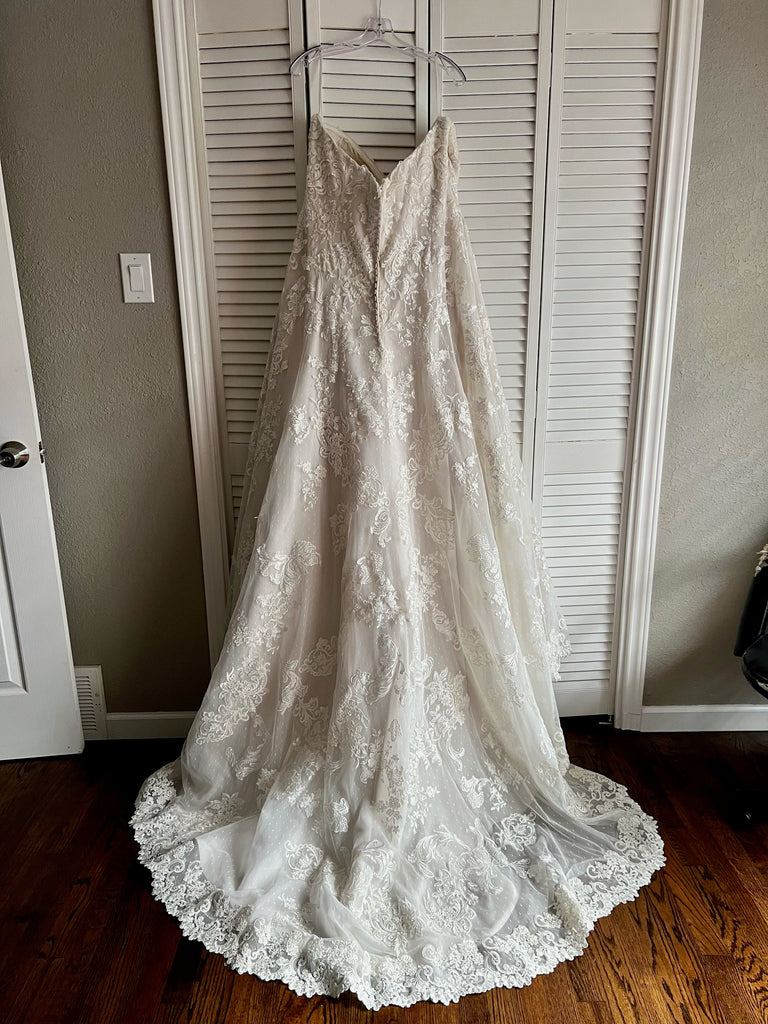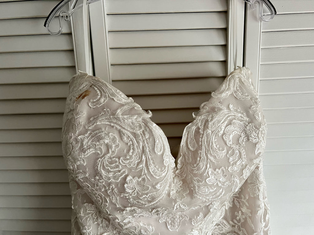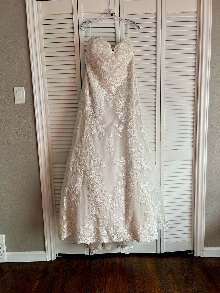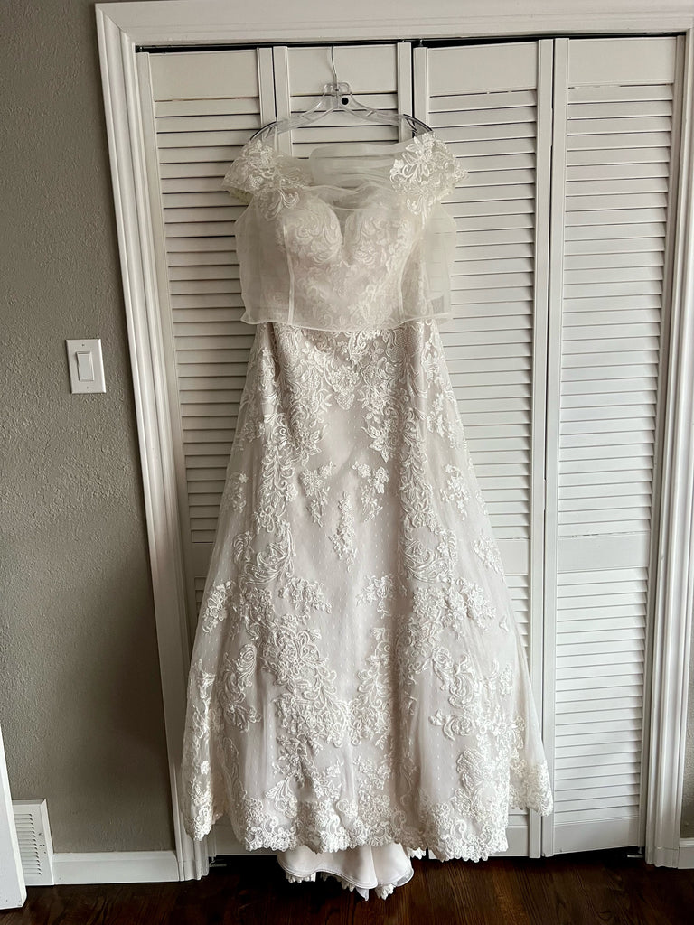 A soft, tulle off-the-shoulder jacket, embroidered with lace accents, comes with the dress as well. I did not wear the jacket on my wedding day, so it is in brand NEW condition.