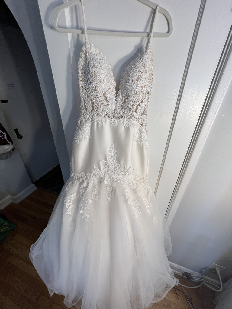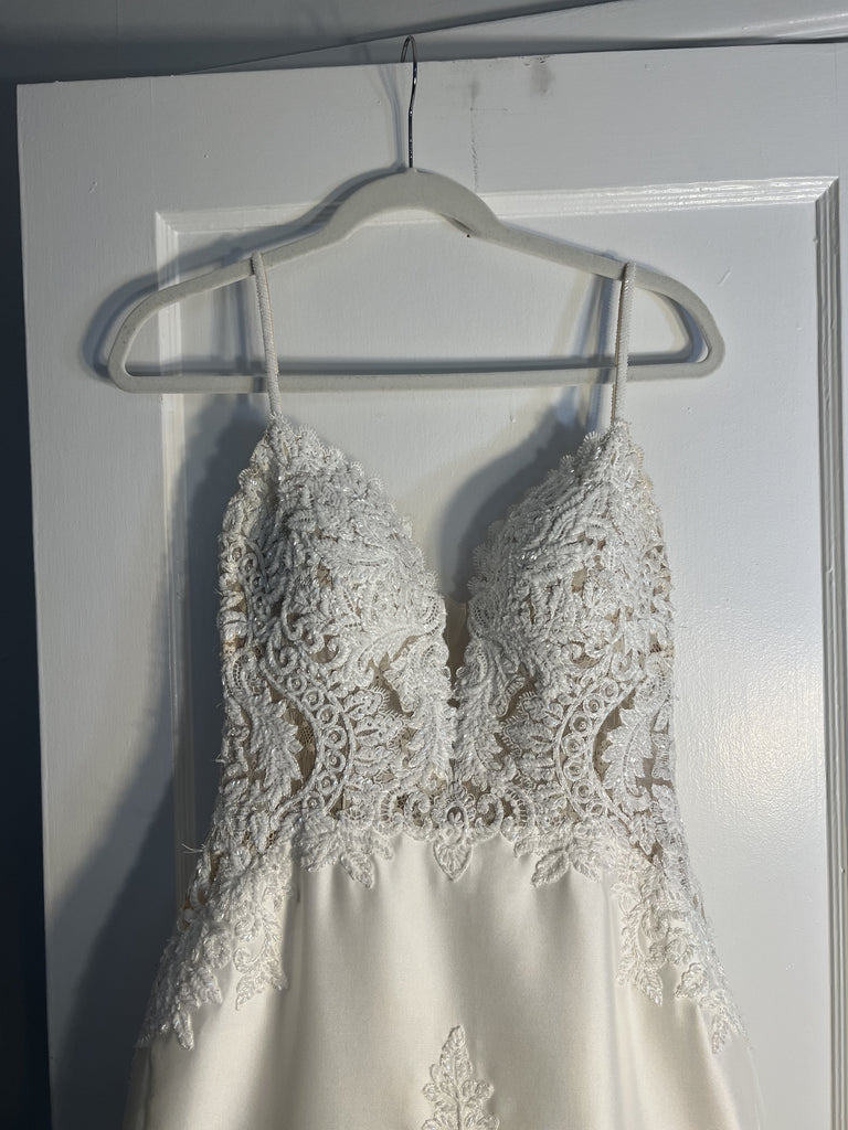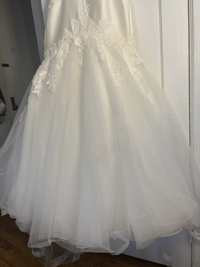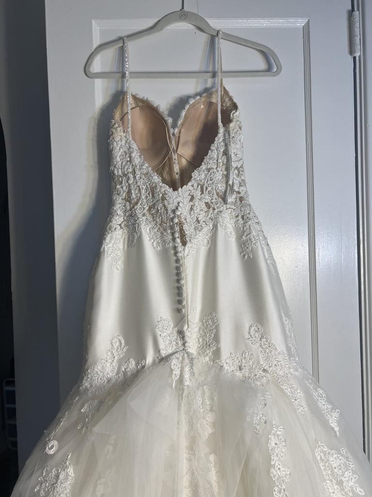 Condition: There are a couple of small, subtle stains on the bottom half of the dress, but they will come out with professional cleaning. The bustle is missing three buttons that will need to be fixed. Otherwise, the dress looks new!