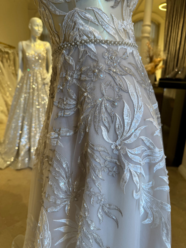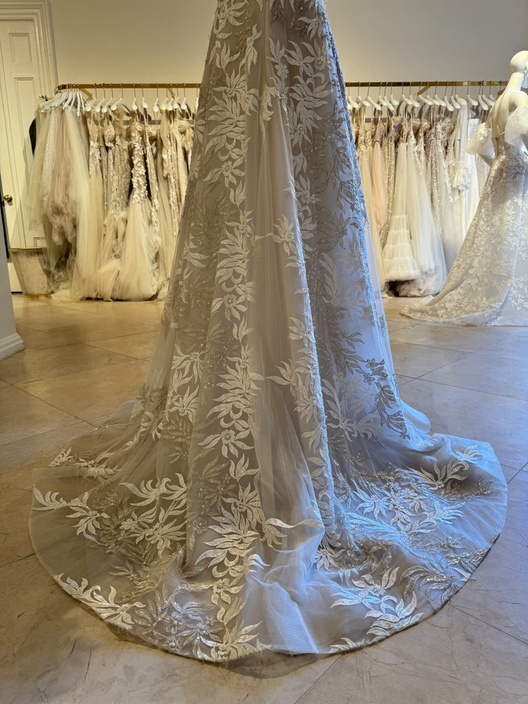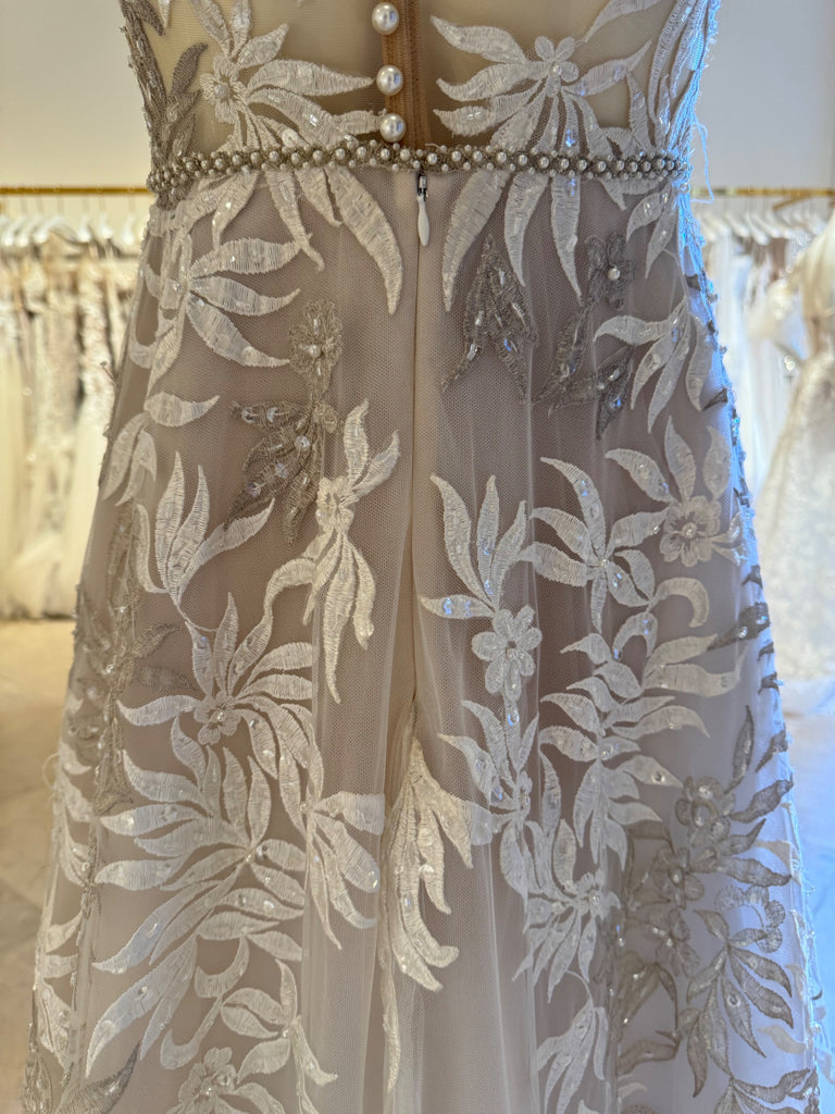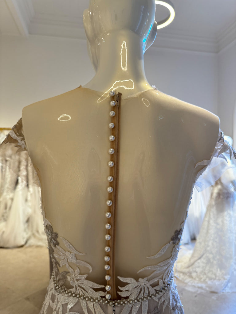 Featuring an off-the-shoulder design, the Daphne gown is crafted with a sheer illusion mesh bodice adorned with a radiant floral lace pattern. This intricate lacework creates the illusion of an off-the-shoulder neckline, blending seamlessly with the sheer mesh to offer a sophisticated and ethereal look. The gown’s stunning sheer back mirrors the floral lace design, accentuated by delicate pearl buttons that run gracefully down the spine, adding a touch of timeless elegance.