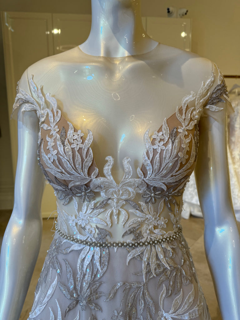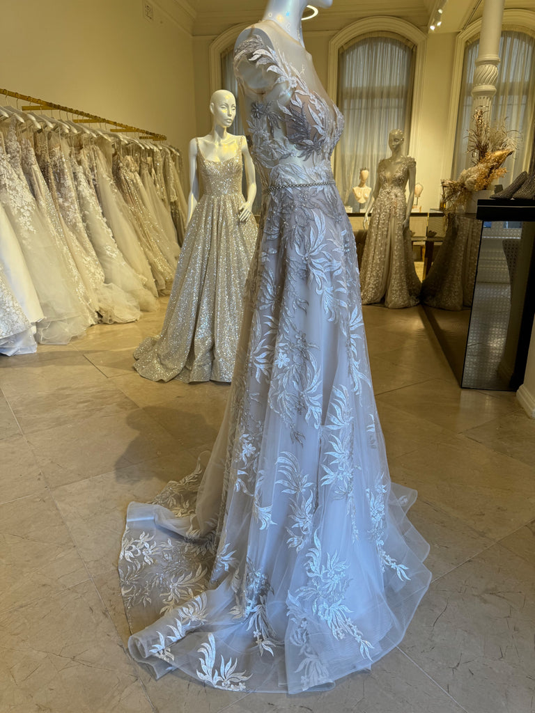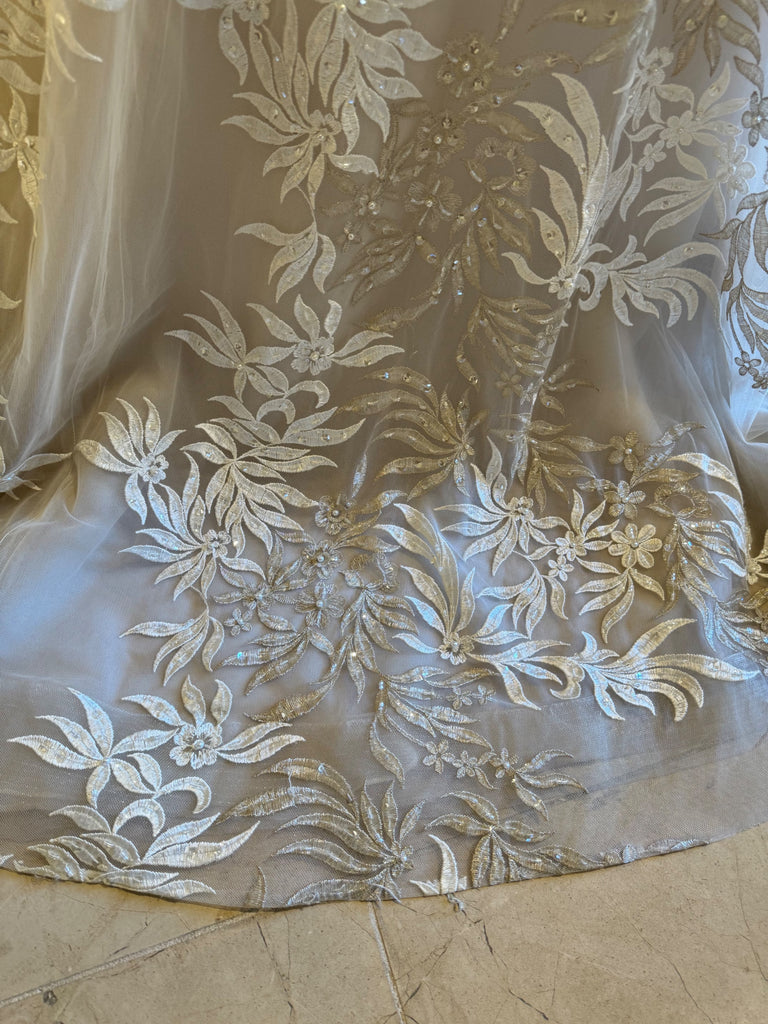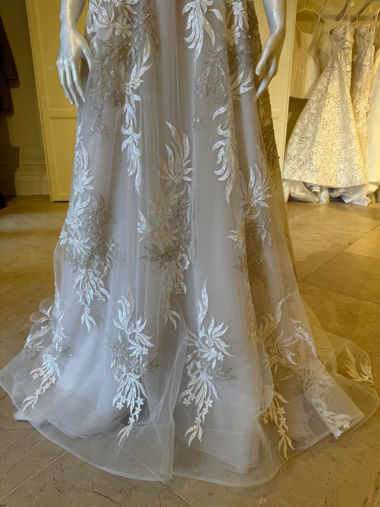 Featuring an off-the-shoulder design, the Daphne gown is crafted with a sheer illusion mesh bodice adorned with a radiant floral lace pattern. This intricate lacework creates the illusion of an off-the-shoulder neckline, blending seamlessly with the sheer mesh to offer a sophisticated and ethereal look. The gown’s stunning sheer back mirrors the floral lace design, accentuated by delicate pearl buttons that run gracefully down the spine, adding a touch of timeless elegance.