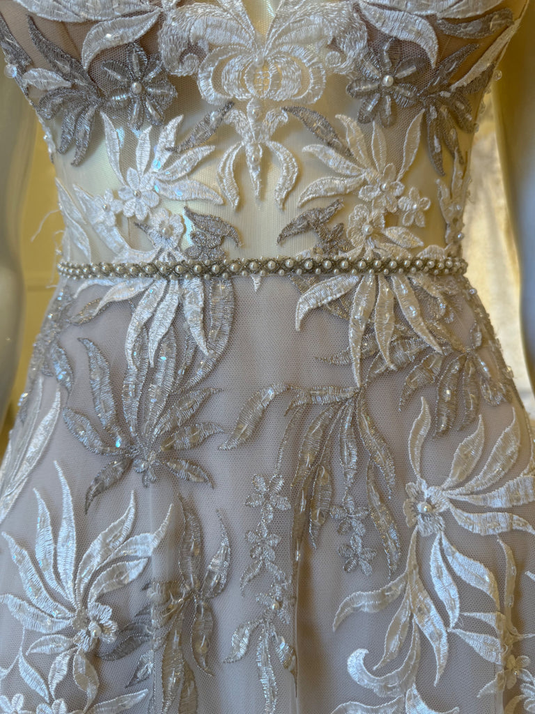 The gown’s A-line silhouette flows effortlessly from the waist, offering a flattering shape that is both graceful and refined. The full skirt cascades into a small train, adding a hint of drama and sophistication that enhances the overall look of the gown. This classic design ensures that the Daphne gown is both captivating and comfortable, making it an ideal choice for a memorable wedding day.