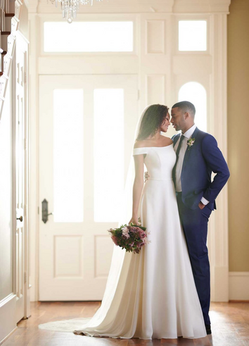 Simply stated, this wedding gown from Martina Liana is a minimalist classic. Crafted with Luxe crepe fabric, this smooth silhouette is a modern masterpiece. The straight-across, off-shoulder neckline is clean and unique, offset by a faux criss-cross back detail with keyhole opening for a subtle twist. The attached crepe belt offers a delicate hint of refined texture, while pockets in the skirt make for a fun and functional surprise. Fabric-covered buttons and a slight train complete the look with elegance and tradition for your modern wedding statement.