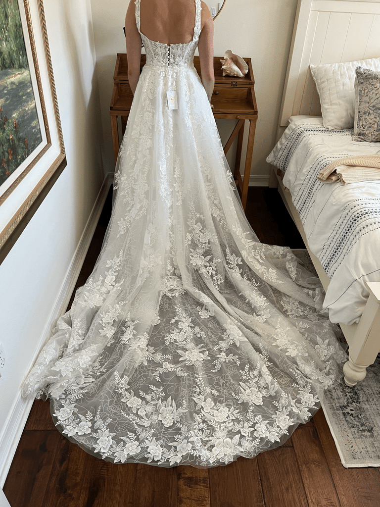 This dress is flawless and absolutely beautiful! The dress is no longer needed and was never altered. This dress is in professional storage at the salon, brand new, and waiting for a lovely bride!