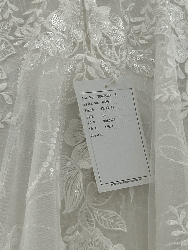 This wedding gown boasts a white-lined bodice with embroidered lace appliques adorned with pearls, glass beads, seed beads, and sequins. The beading cascades down past your natural waist and continues onto the voluminous skirt. The skirt is finished in a sweeping semi-cathedral train with a softly scalloped hem, providing undeniable beauty from top to bottom. The unlined bodice features visible boning, creating a corset-inspired silhouette that’s both timeless and modern.