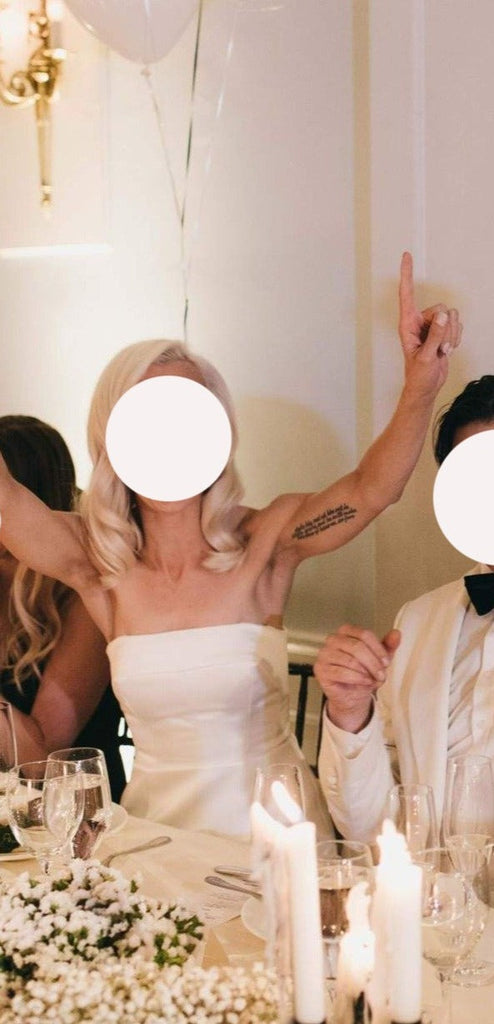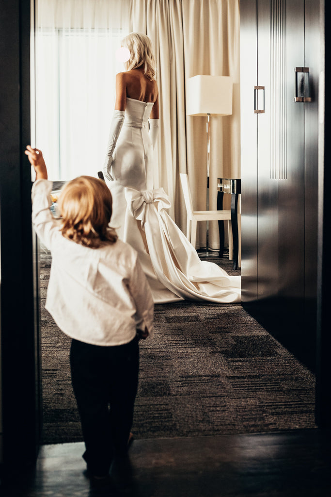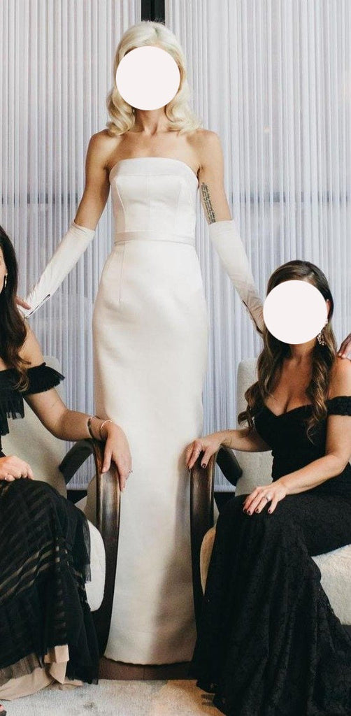 It has a very structured bodice and from the waist down, it features a sculptural skirt that wraps around the body seamlessly. It falls straight down from your hips in a very structured way that you feel like you float across a room, with a signature origami bow detailing on the back that drapes into a dramatic train.