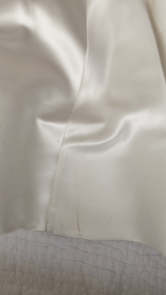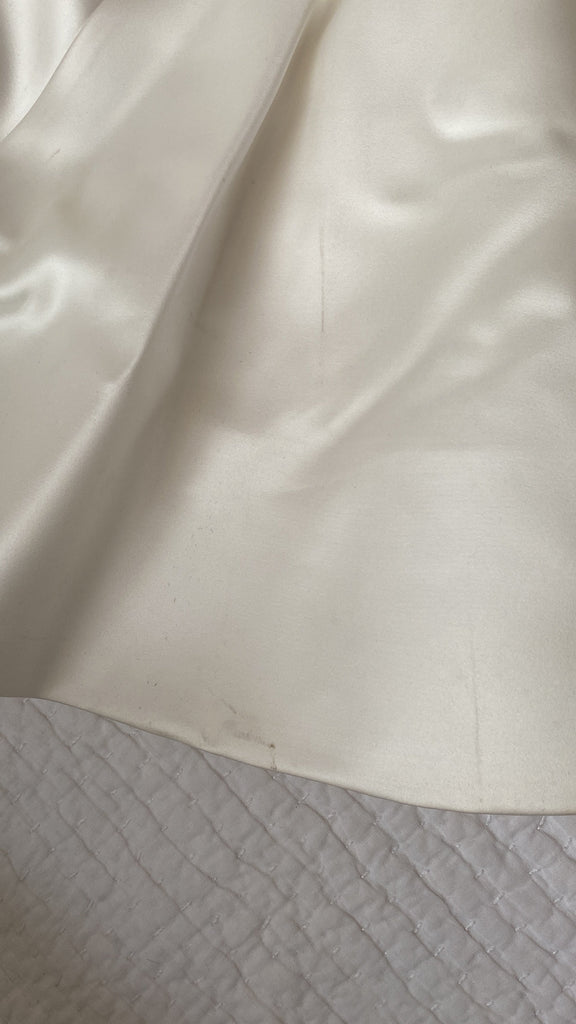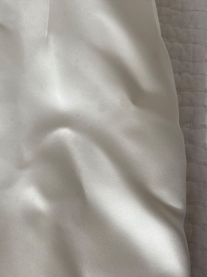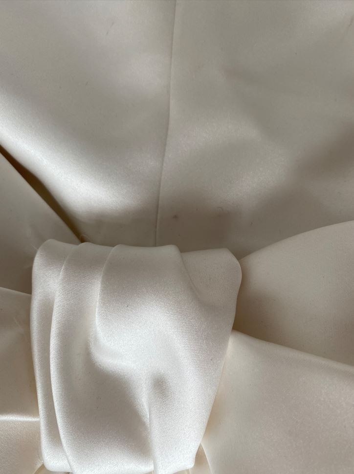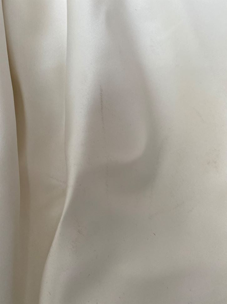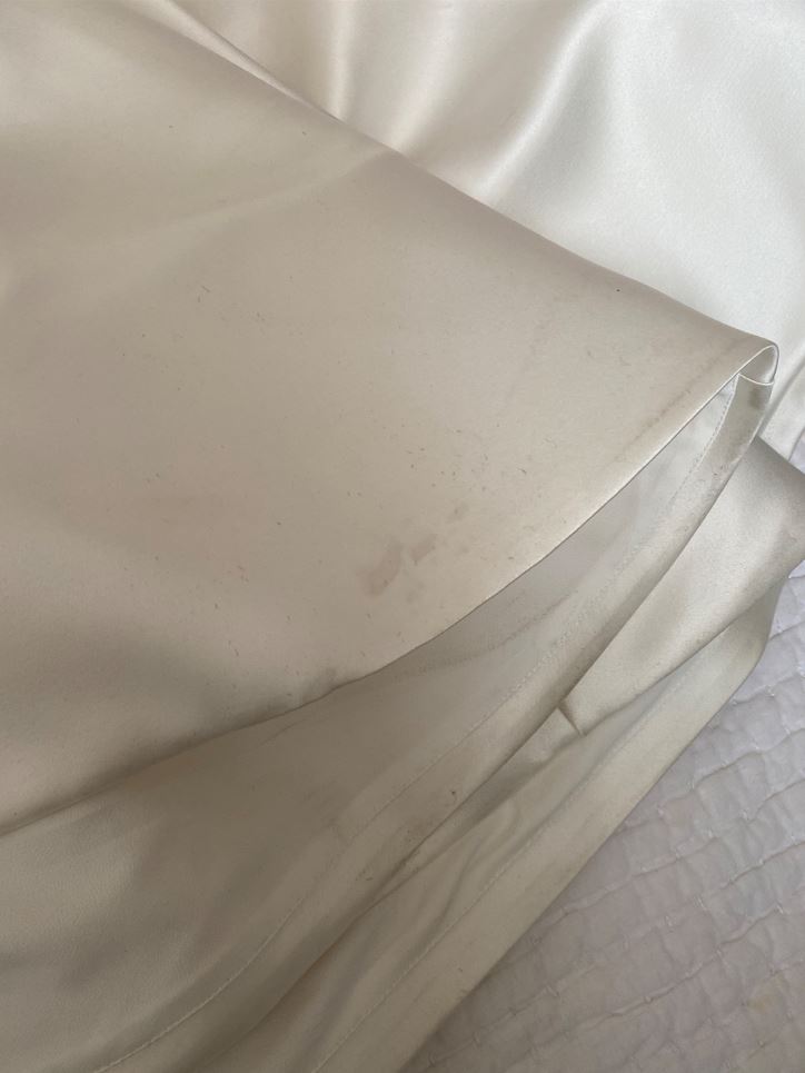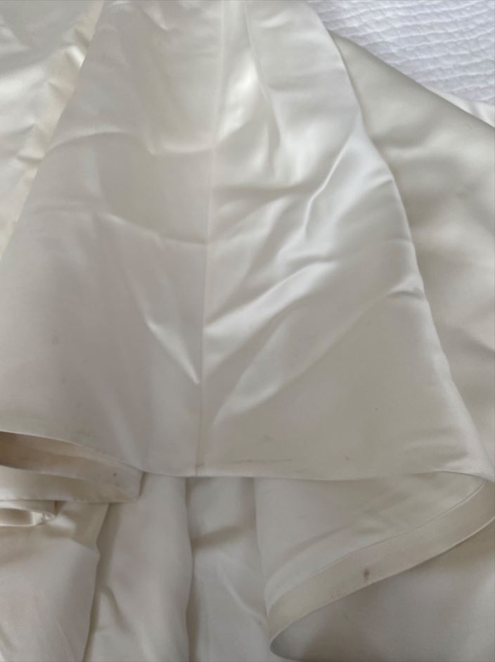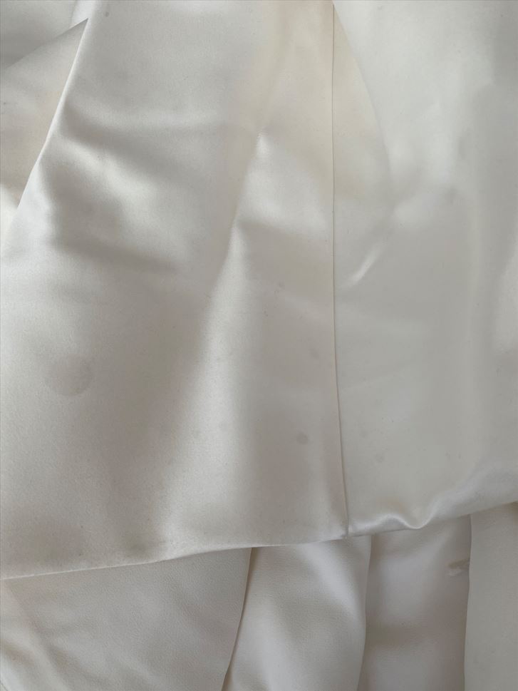 Condition: There are some blemishes along the bottom, on the train (bottom back side), near the bow, and the front of the dress, please see photos.