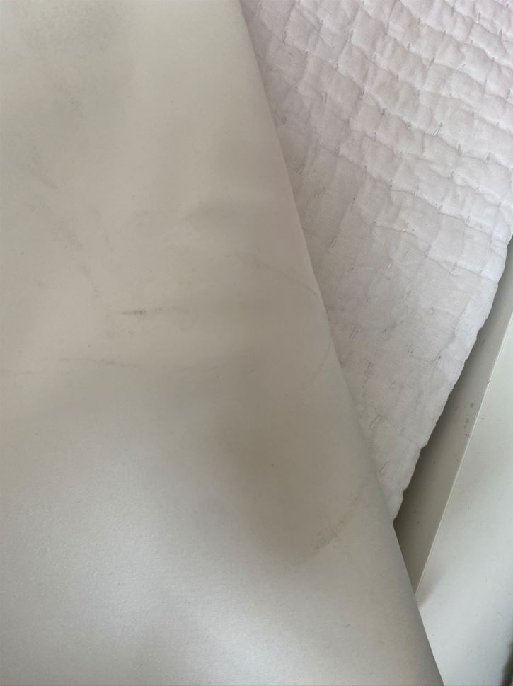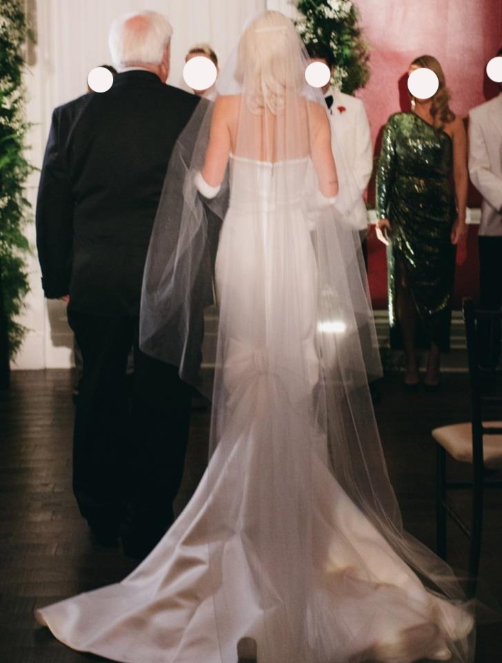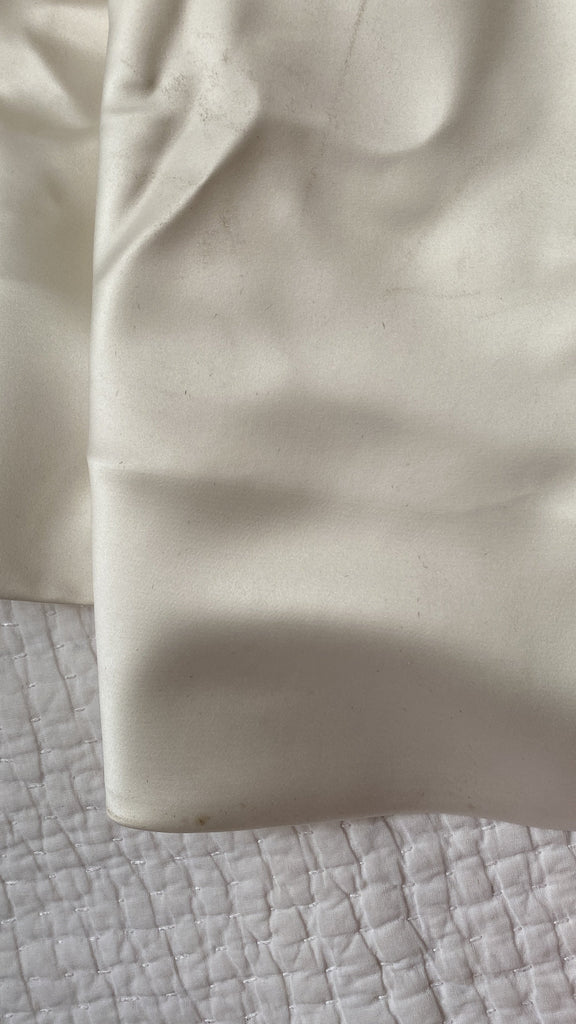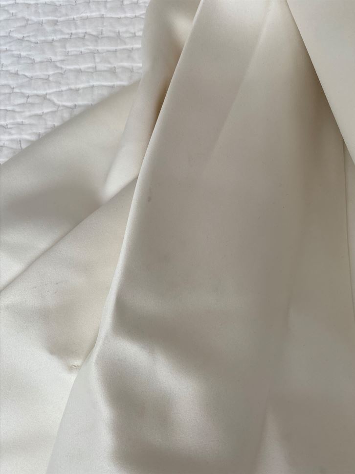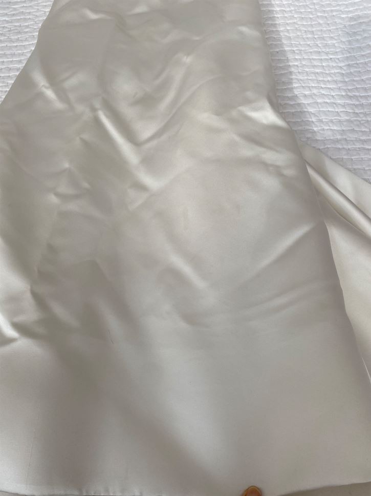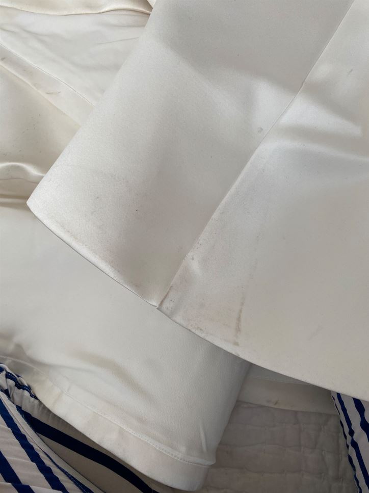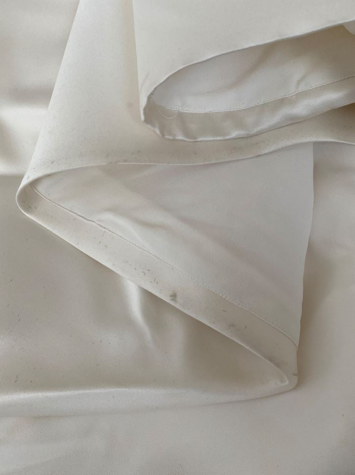 Condition: There are some blemishes along the bottom, on the train (bottom back side), near the bow, and the front of the dress, please see photos.
